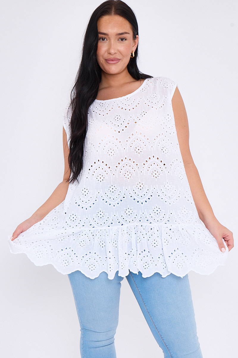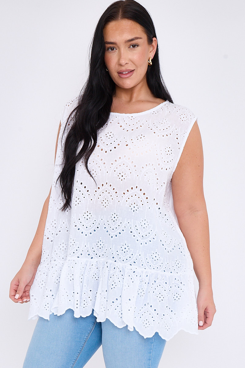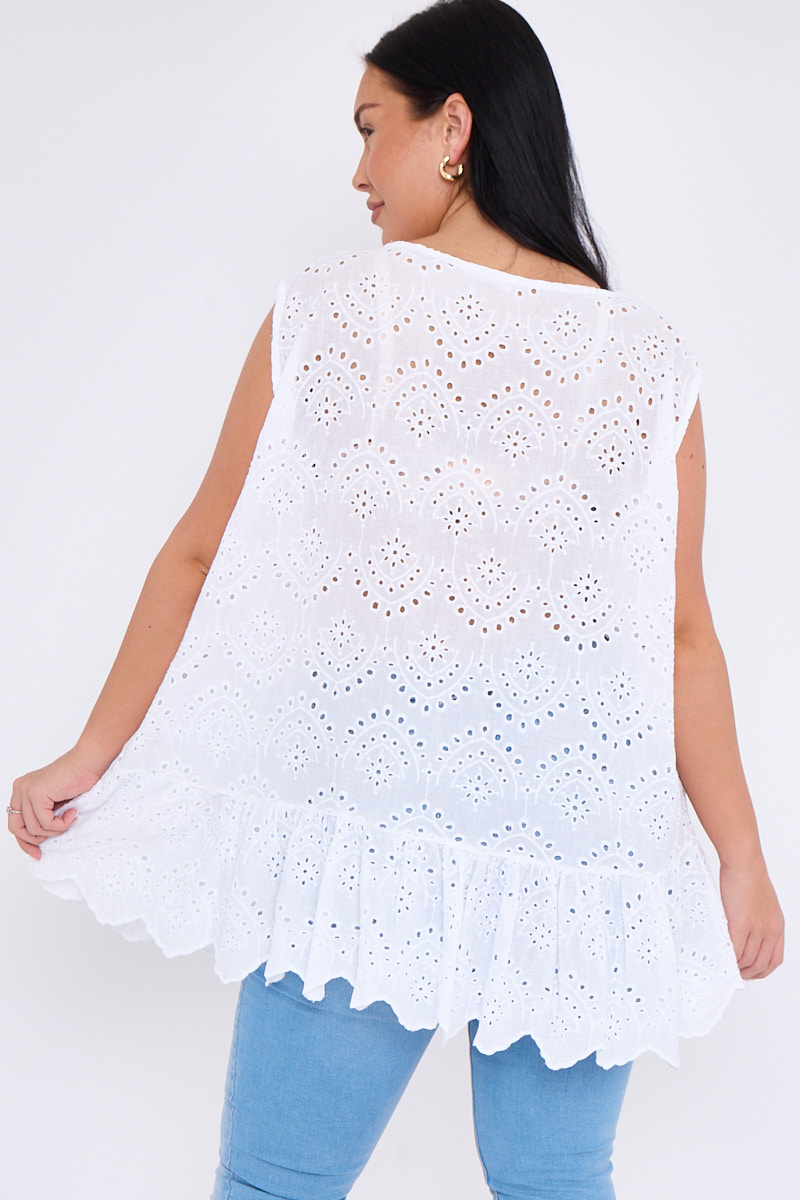 Plus Size White Broderie Round Neck Sleeveless Top With Frill Hem x 5