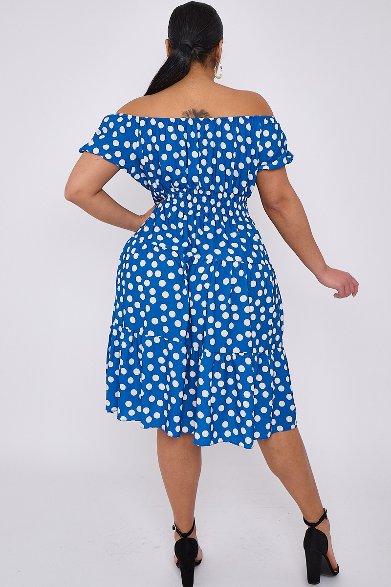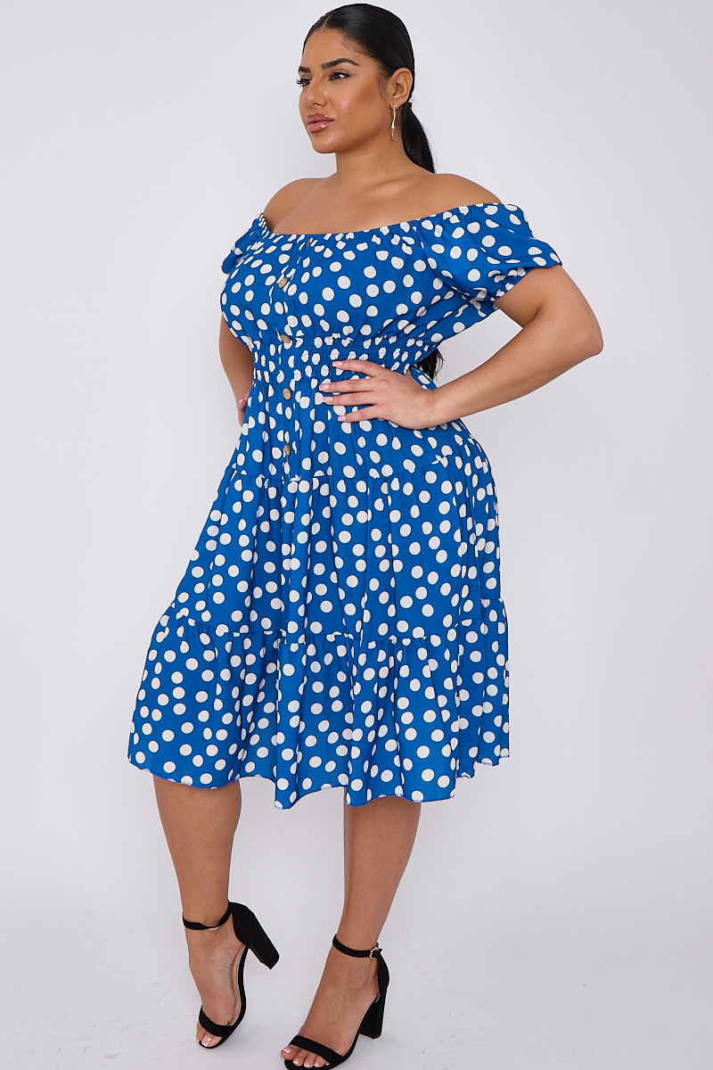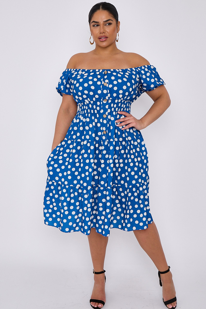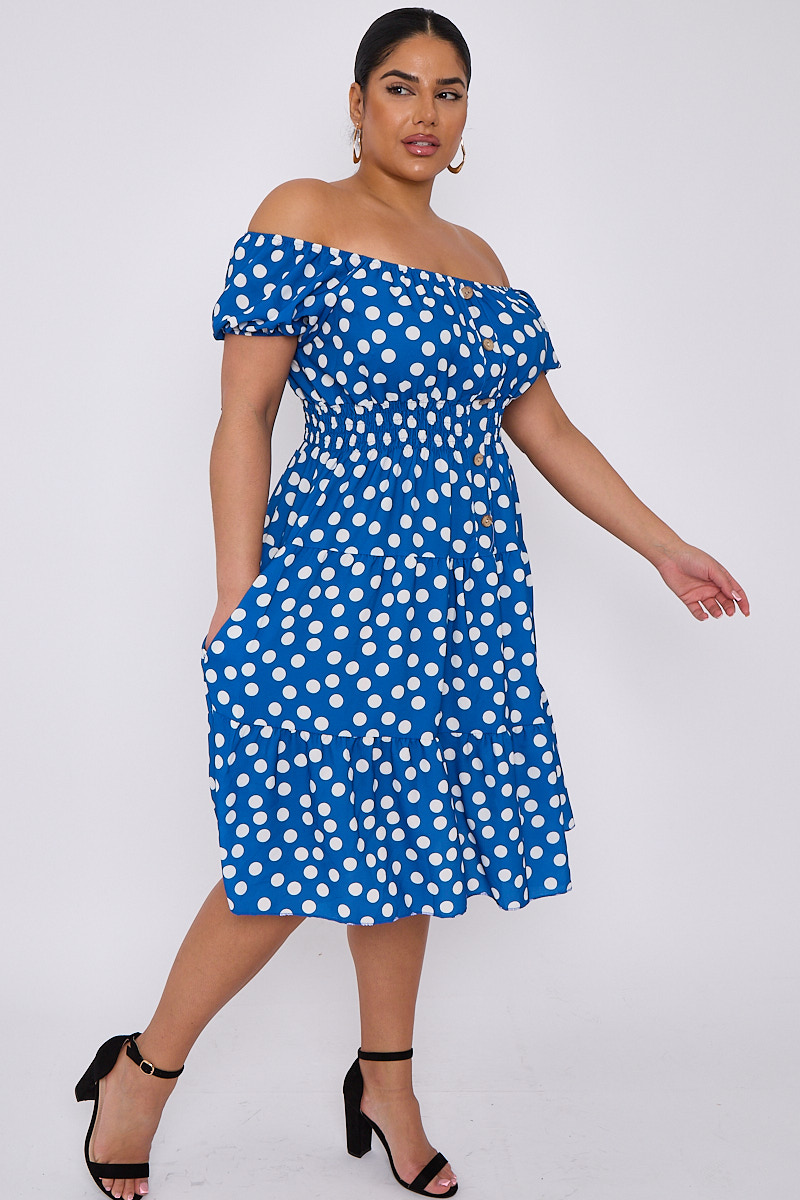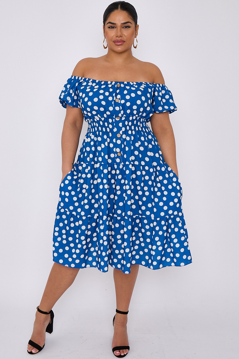 Plus Size Blue Polka Dot Bardot Button Detail Dress With Pockets x 5