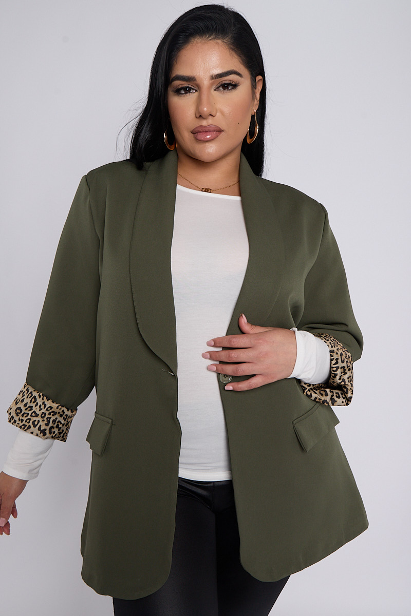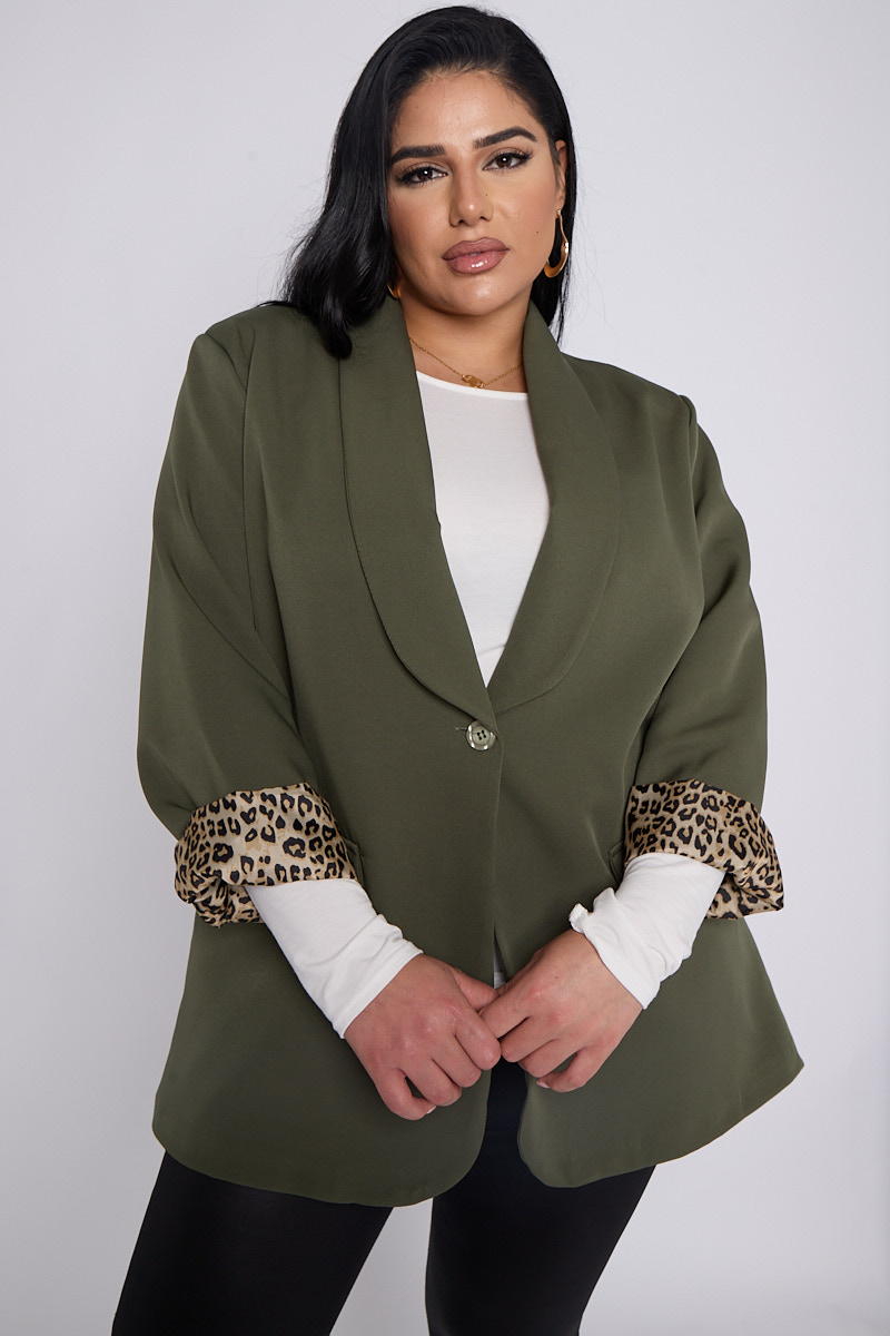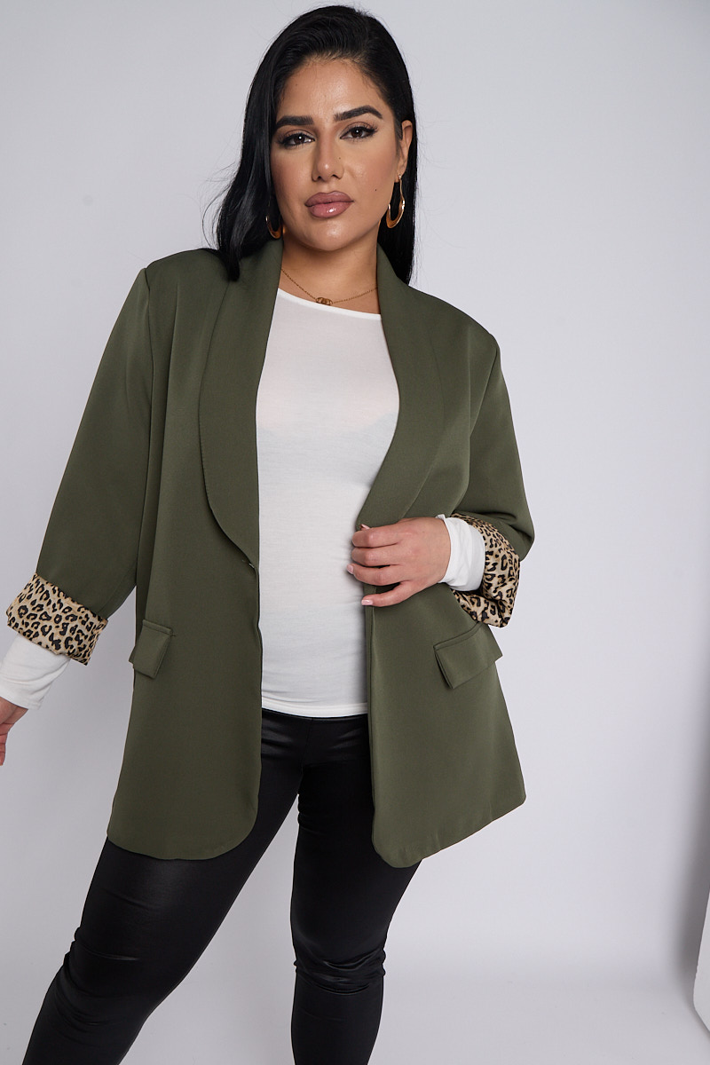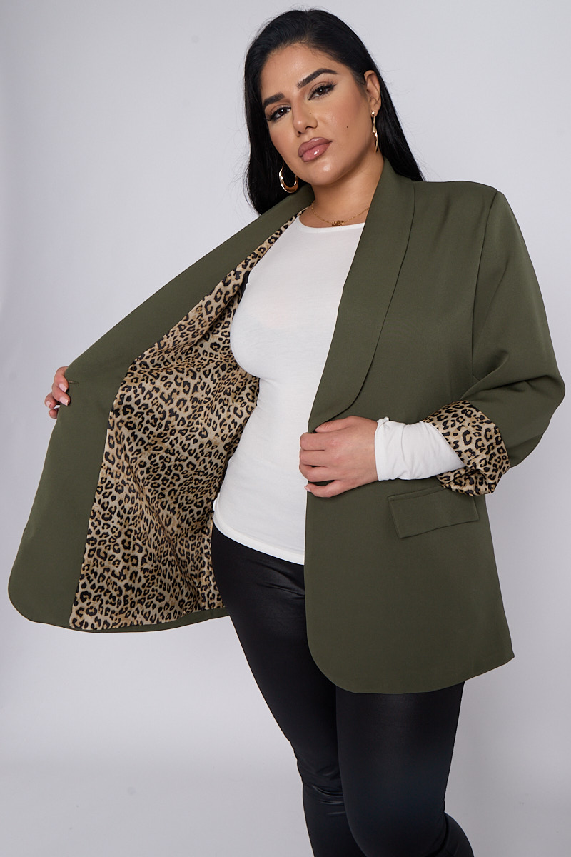 Plus Size Khaki Leopard Detail Blazer With Pocket Detail x 5