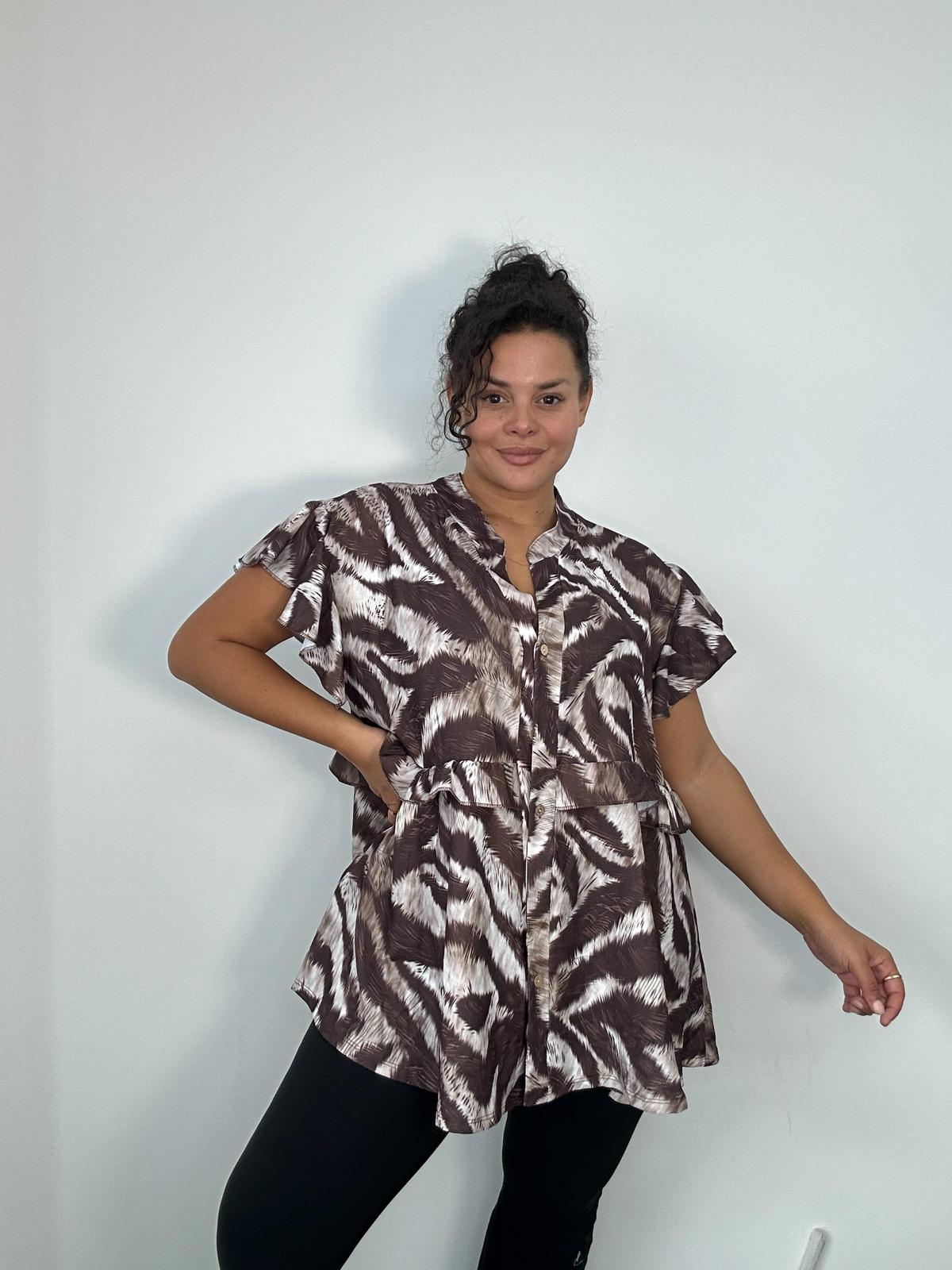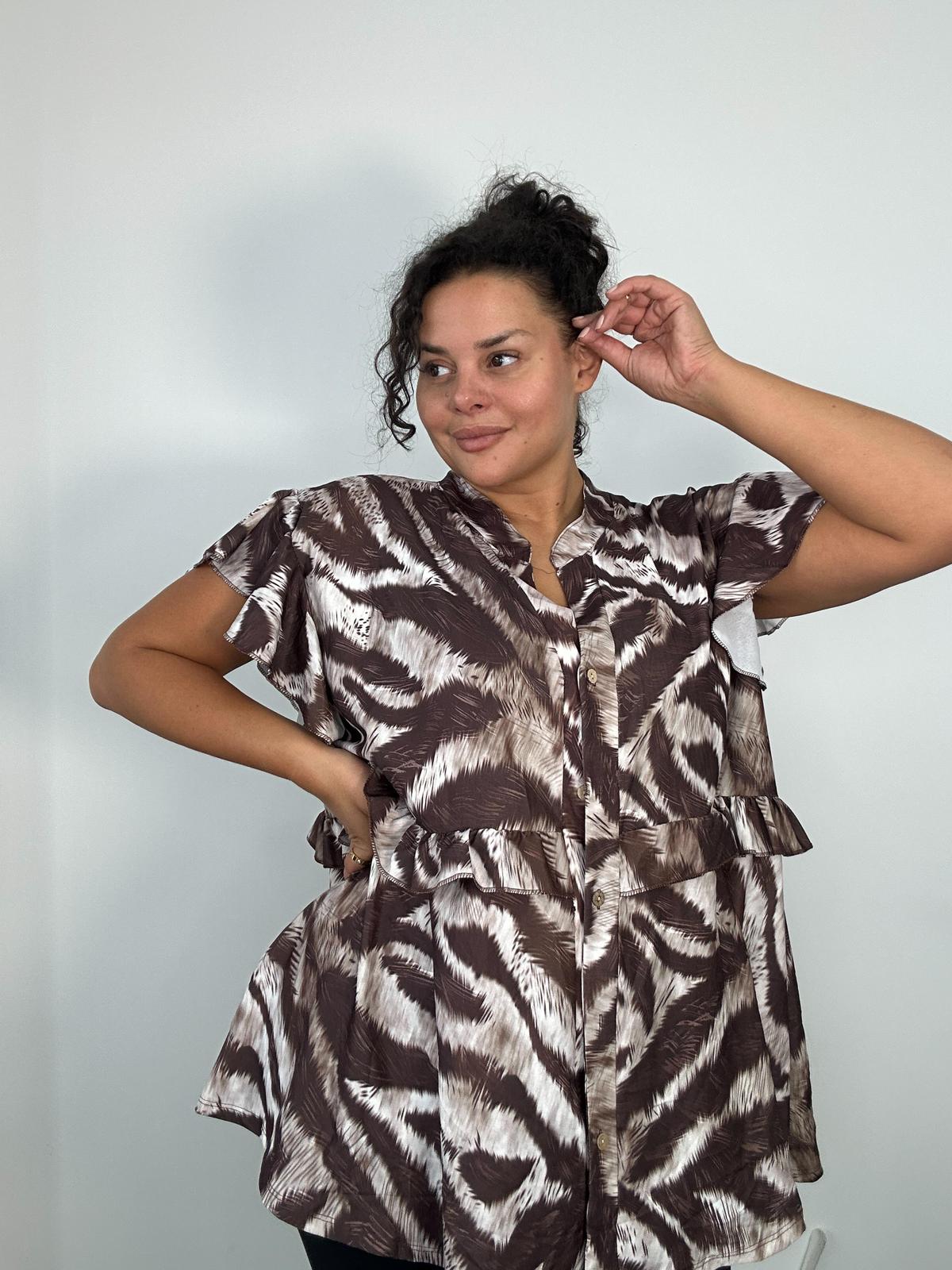 Add a bold statement piece to your plus-size range with our Curve Collection Abstract Zebra Print Button-Down Top. Designed with a flattering relaxed fit, button-front closure, and cinched waist detail, this top combines comfort and style effortlessly. The lightweight fabric and short flutter sleeves make it a versatile piece for casual outings, office wear, or evening looks. Perfect for plus-size fashion retailers looking to stock trendy, inclusive designs.
