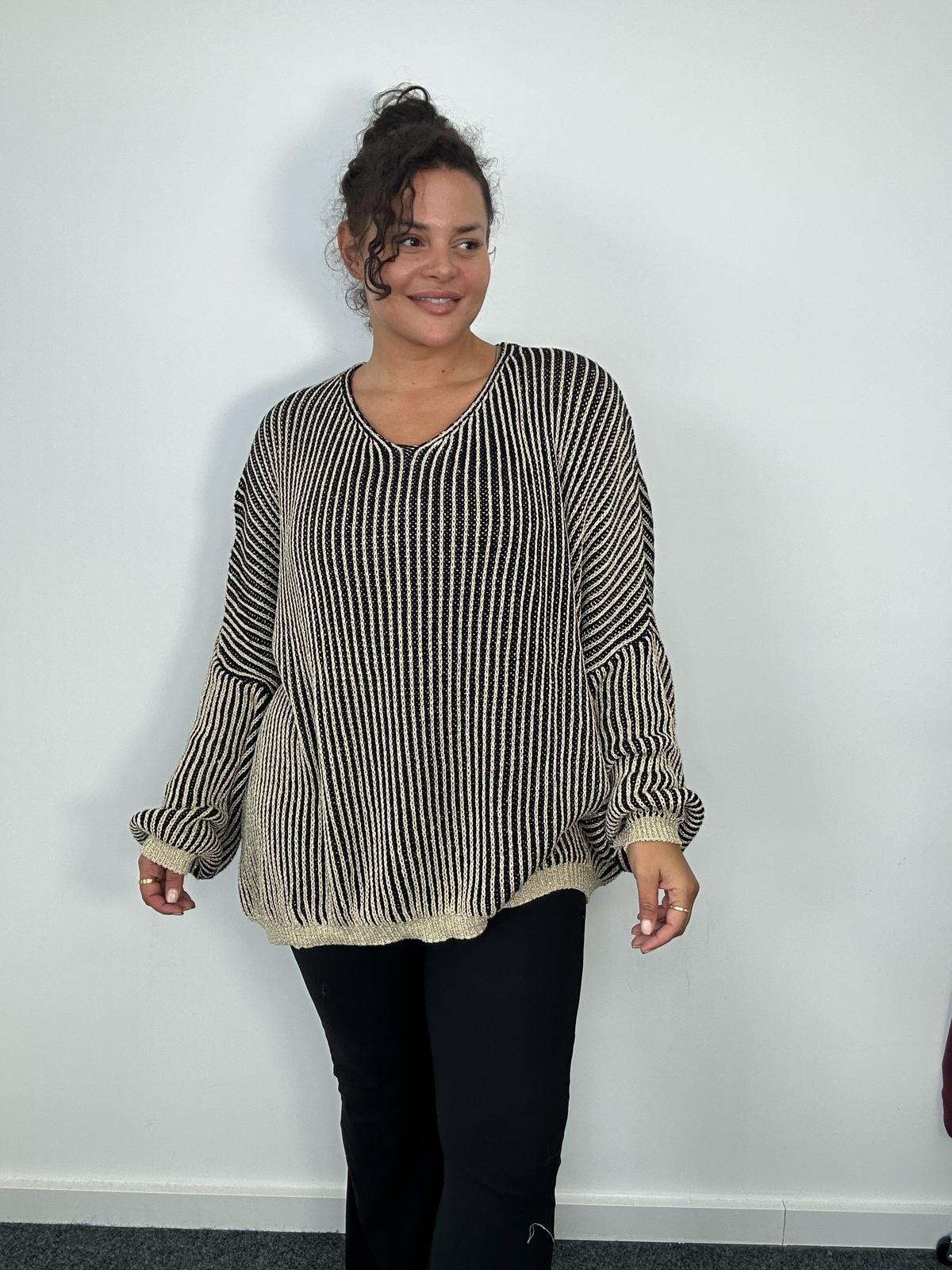 Introduce cosy chic style to your plus-size wholesale range with our Curve Collection Black & Beige Stripe Knit Jumper. Featuring a soft knit fabric, flattering v-neckline, and balloon sleeves, this top blends comfort and fashion effortlessly. Its relaxed fit makes it a versatile piece that works for casual days, workwear layering, or evening looks. A must-have for retailers looking to stock curve-friendly knitwear staples.