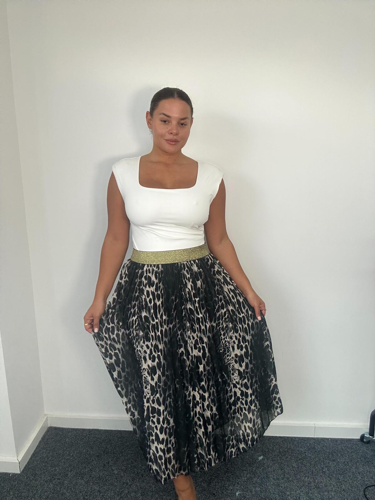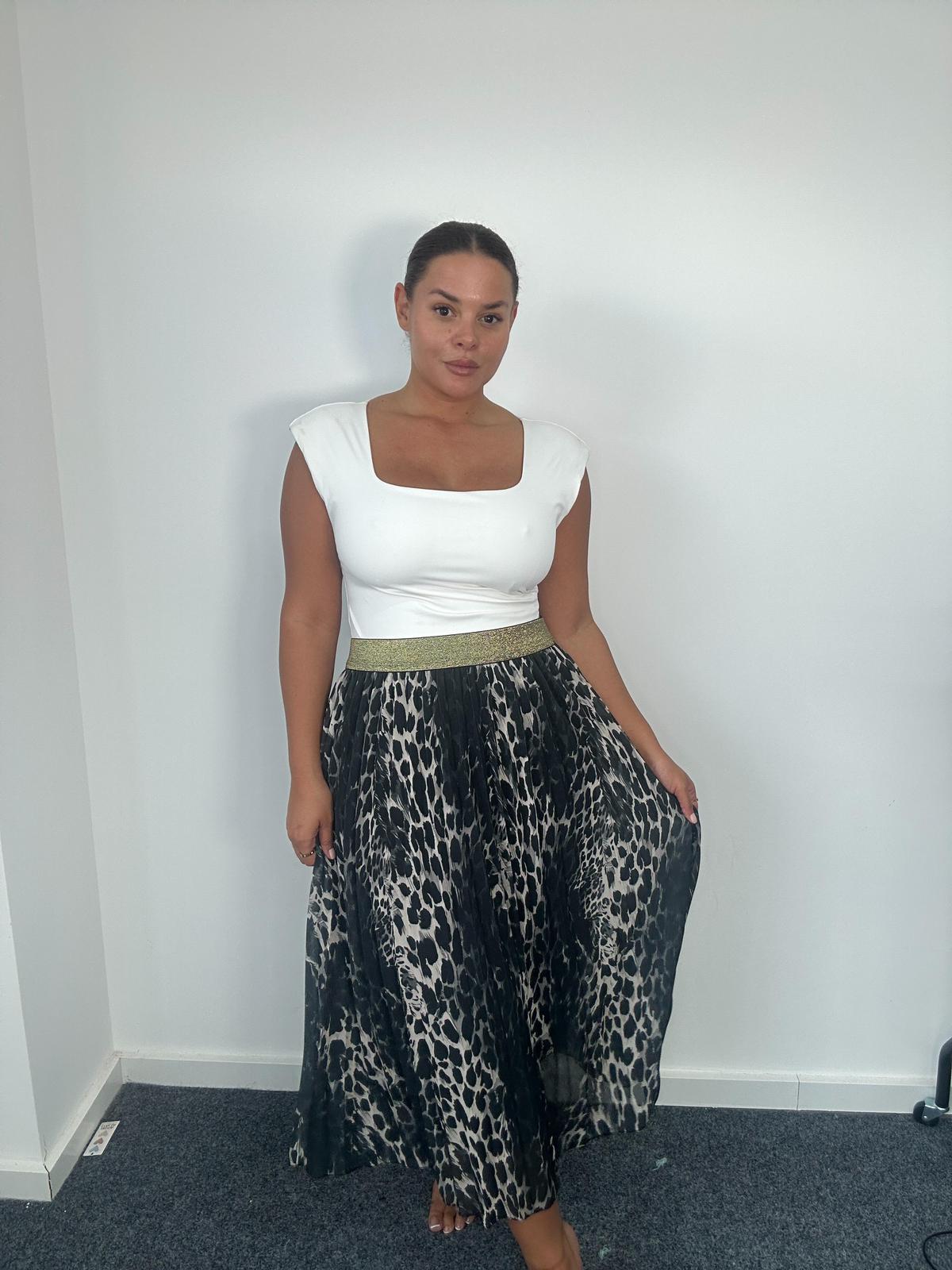 Bring a bold, fashion-forward piece to your plus-size range with our Curve Collection Leopard Print Midi Skirt. Designed with a flowy, lightweight fabric and a comfortable elasticated gold waistband, this skirt offers a flattering A-line silhouette perfect for both casual and dressy occasions. A versatile statement piece that allows your customers to dress it up with heels or keep it casual with trainers.
