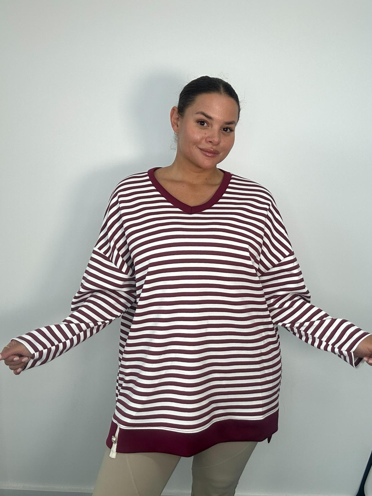 Curve Collection Plus Size Burgundy & White Stripe V-Neck Tunic Top x 2, 3 & 5 Pack Options