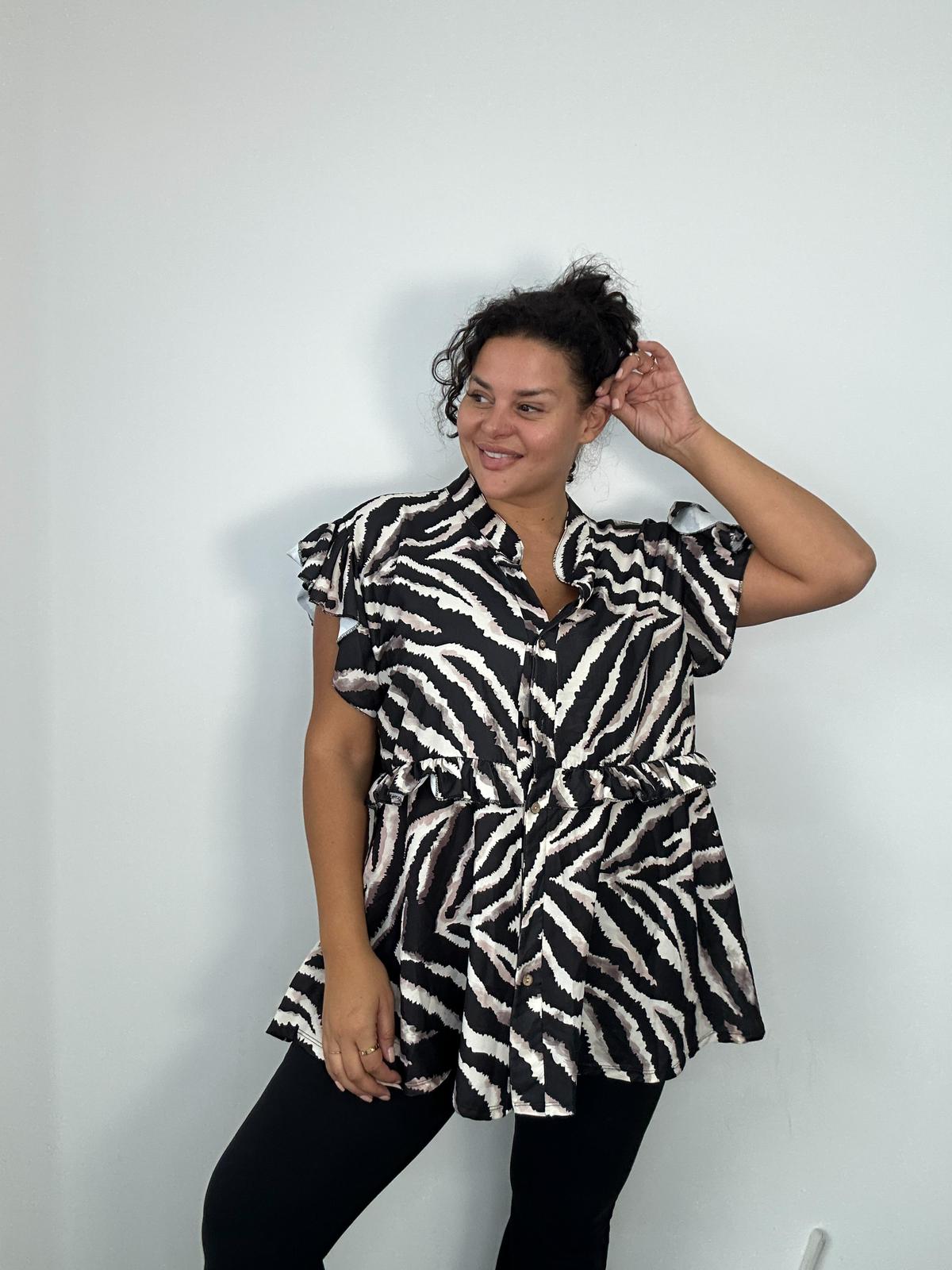 Add a bold statement piece to your plus-size range with our Curve Collection Zebra Print Button-Down Top. Designed with a flattering relaxed fit, button-front closure, and cinched waist detail, this top combines comfort and style effortlessly. The lightweight fabric and short flutter sleeves make it a versatile piece for casual outings, office wear, or evening looks. Perfect for plus-size fashion retailers looking to stock trendy, inclusive designs.