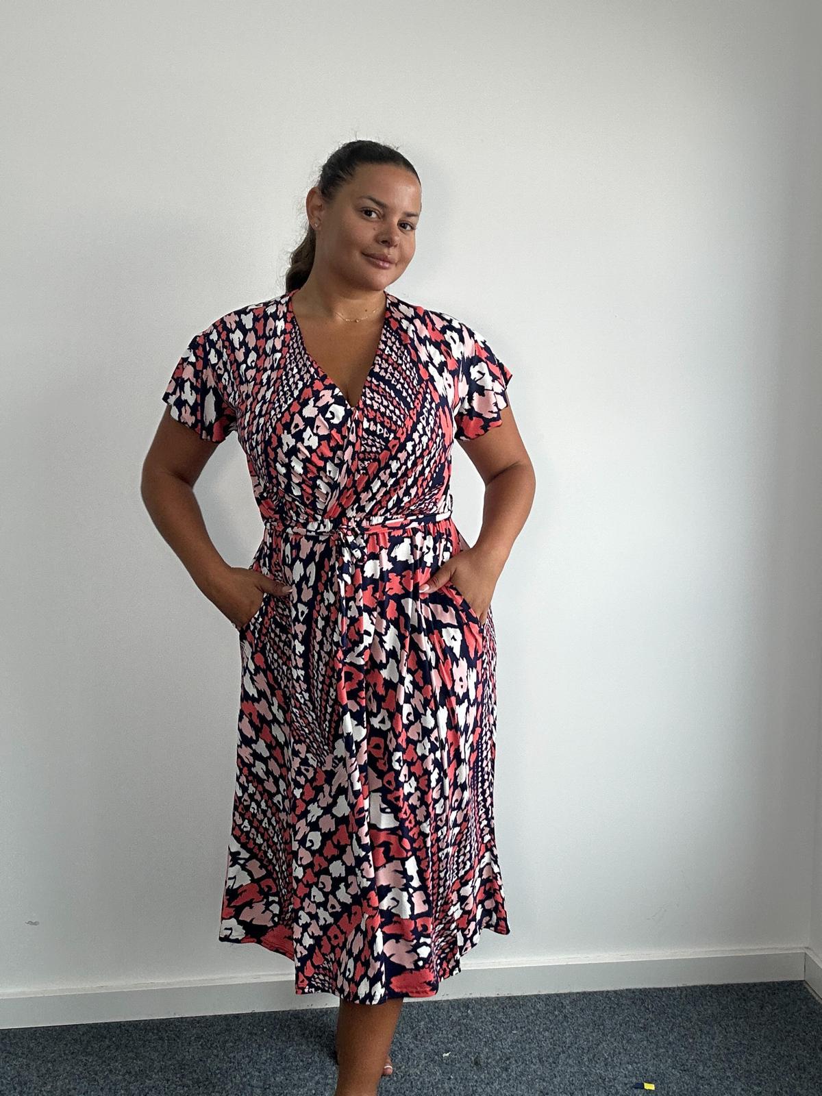 Inject vibrant energy into your plus-size collection with this Printed Midi Dress. Designed in a curve-flattering silhouette, it features a soft  vneckline, short sleeves, and an adjustable drawstring waist for a comfortable, custom fit. The all-over print making it a standout piece for holiday shops, casual edits, or summer boutique collections. A bold print with everyday ease, tailored specifically for fuller figures.