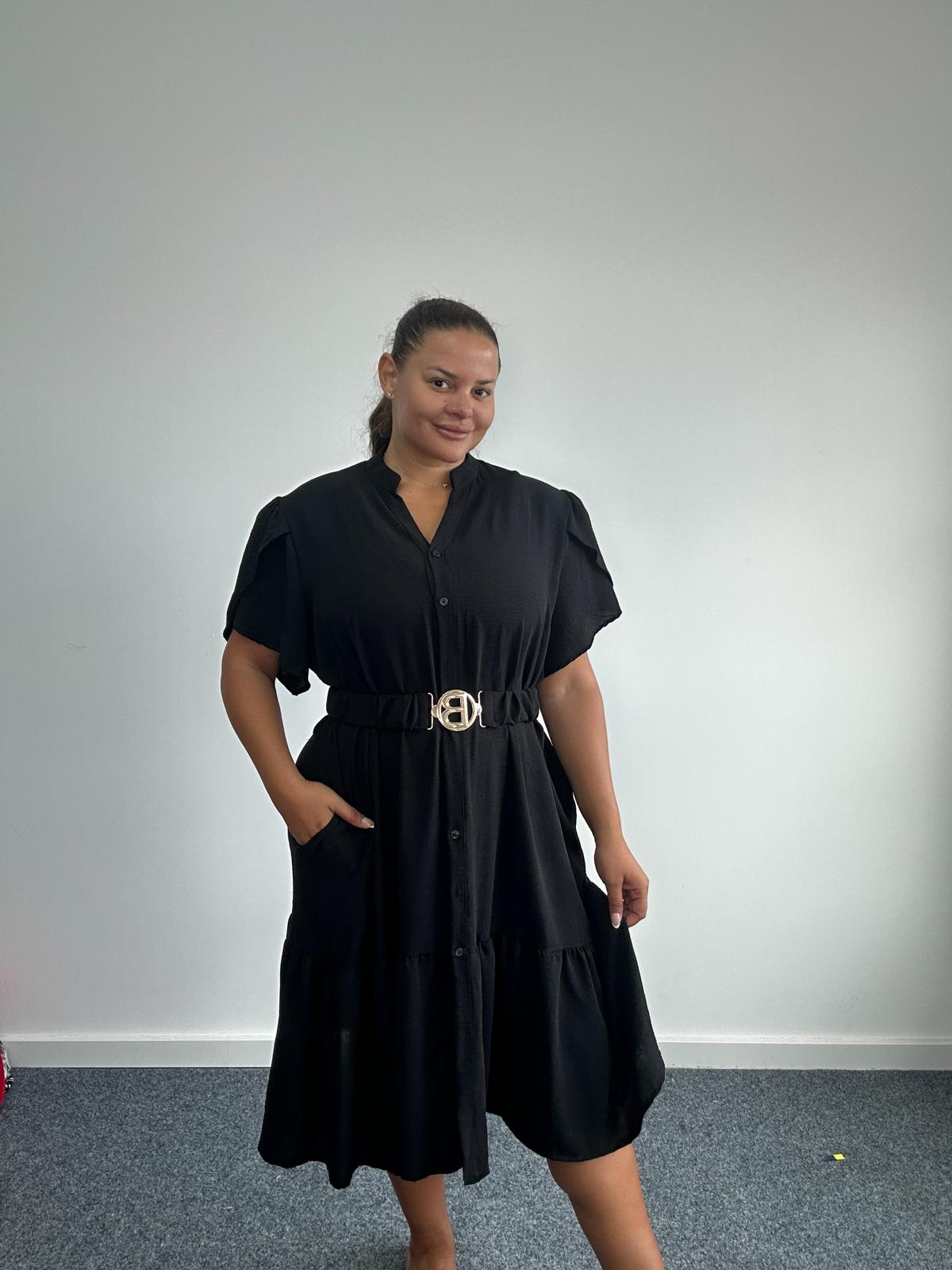 Make a statement with this bold and beautiful Plus Size Black Shirt Dress, crafted to flatter fuller silhouettes with ease and colour confidence. Featuring a full button-down front, short flutter sleeves, and a gathered tiered hem, this piece is finished with a matching stretch belt and standout gold buckle detail. Designed for versatility, this dress transitions effortlessly from daytime occasionwear to weekend style, making it a key piece for plus size collections.