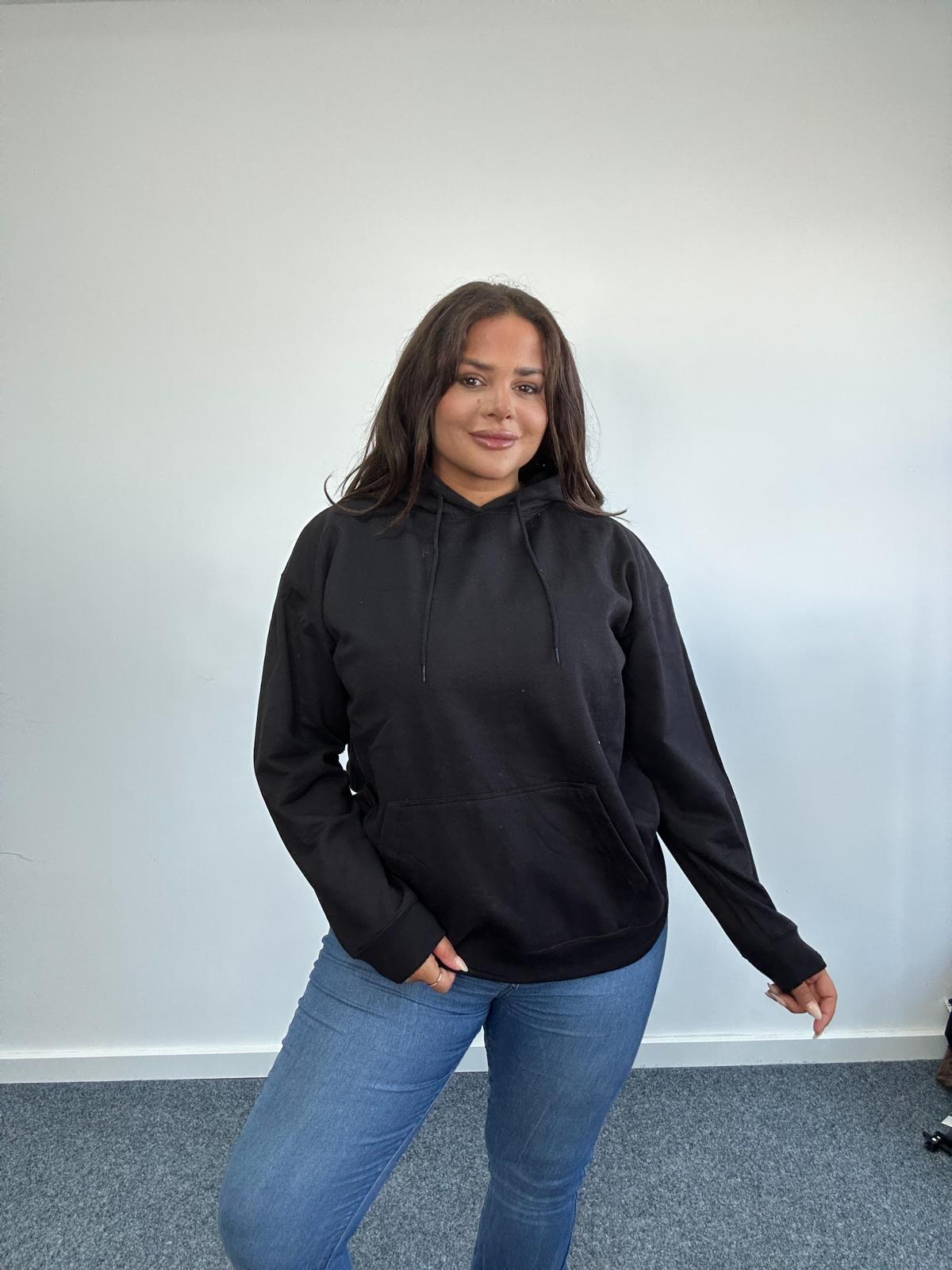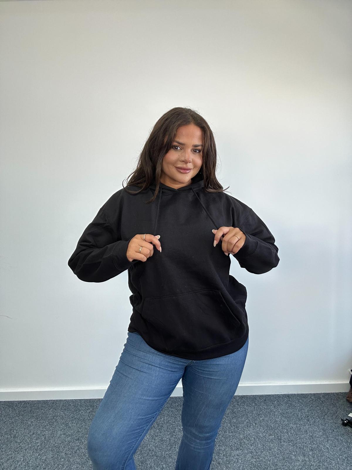 Keep it casual and comfortable with this Curve Plus Size Black Hoodie, designed in a soft, breathable fabric for everyday wear. Featuring a relaxed fit, long sleeves, and a classic hood with adjustable drawstrings, this hoodie is a must-have layering piece for any season. The pocket adds both style and practicality, making it perfect for lounging, errands, or pairing with jeans and leggings for an effortless off-duty look.