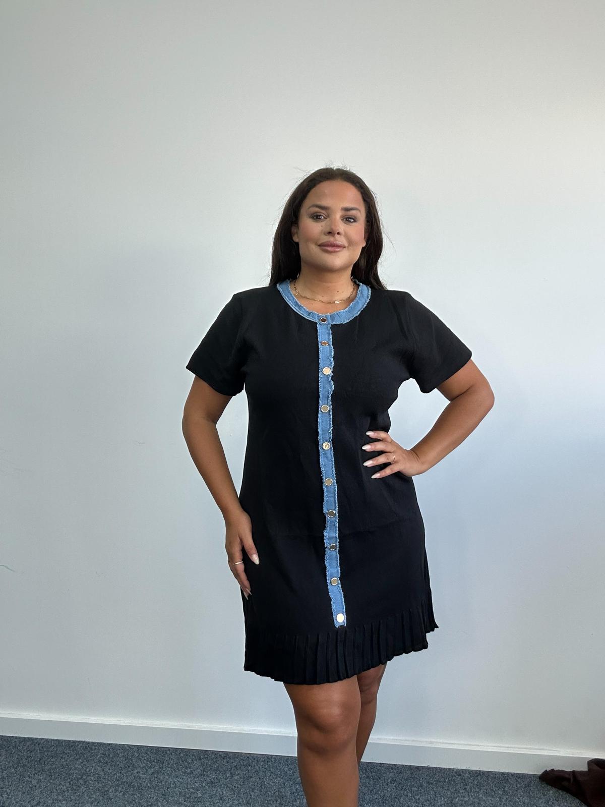 This Curve Plus Size Black Knit Dress blends casual comfort with statement detailing. Designed in a soft knit fabric, it features a round neckline and central placket trimmed with contrast denim for a modern twist. Gold-tone buttons add a chic touch, while the short sleeves keep it versatile for all seasons. The pleated hemline offers feminine movement, making this dress perfect for both casual days and smart casual occasions. An easy to style piece your customers will love.