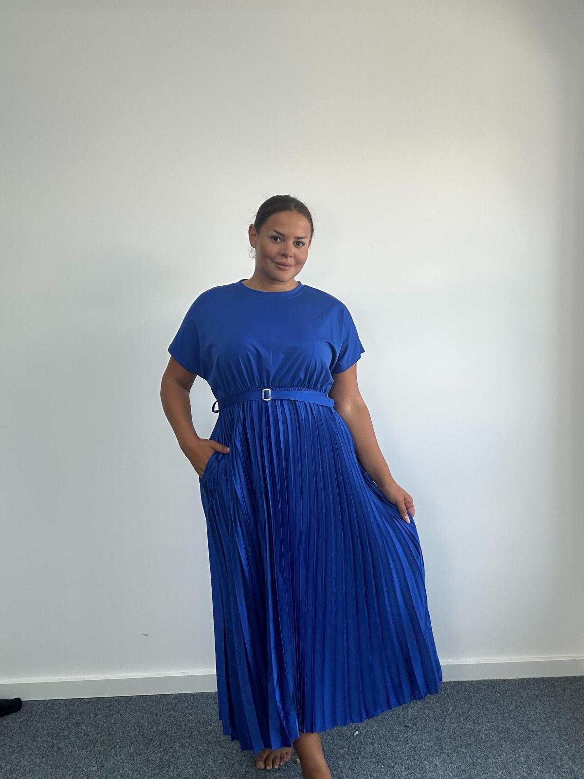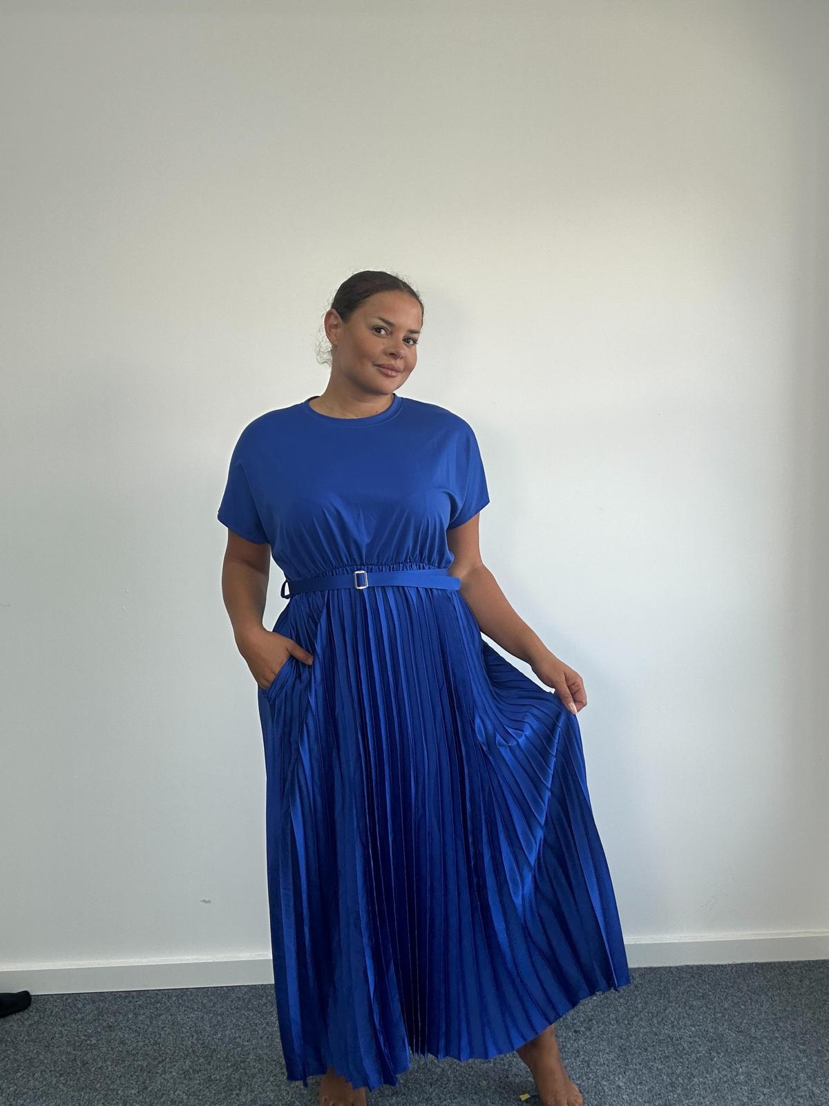 Chic, flattering, and effortlessly elegant, this curve plus size midi dress is a standout piece for any occasionwear or smart-casual collection. Featuring a soft jersey-style top with short sleeves, a matching belt to define the waist, and a beautifully pleated satin-look skirt, this dress offers both comfort and style. Ideal for day-to-night wear, special events, or capsule wardrobes.