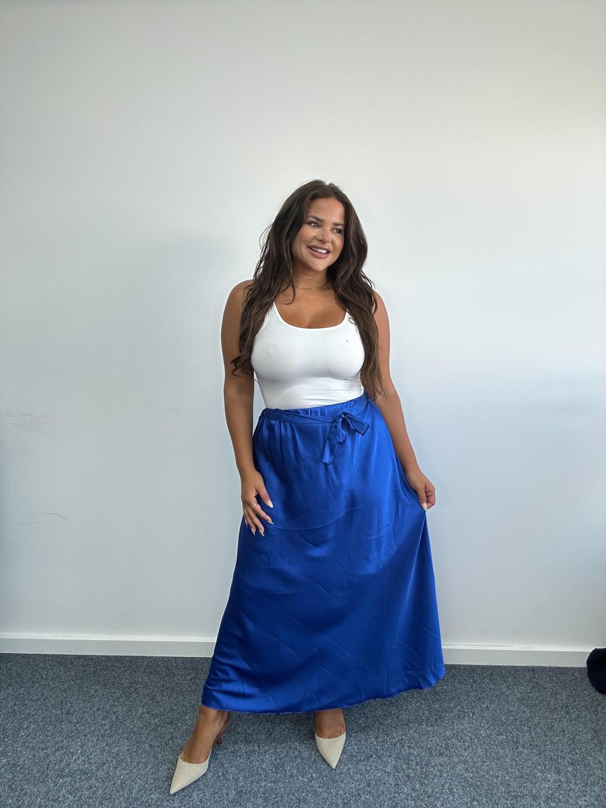 This Curve Plus Size Blue Midi Skirt offers a perfect blend of comfort and elegance for any occasion. Crafted from a lightweight, flowy fabric, it drapes beautifully over curves while providing all day wearability. The elasticated waistband with matching tie detail allows for a flexible fit. Ideal for pairing with blouses, knitwear, or casual tops, this skirt is a versatile must-have for your wholesale collection.