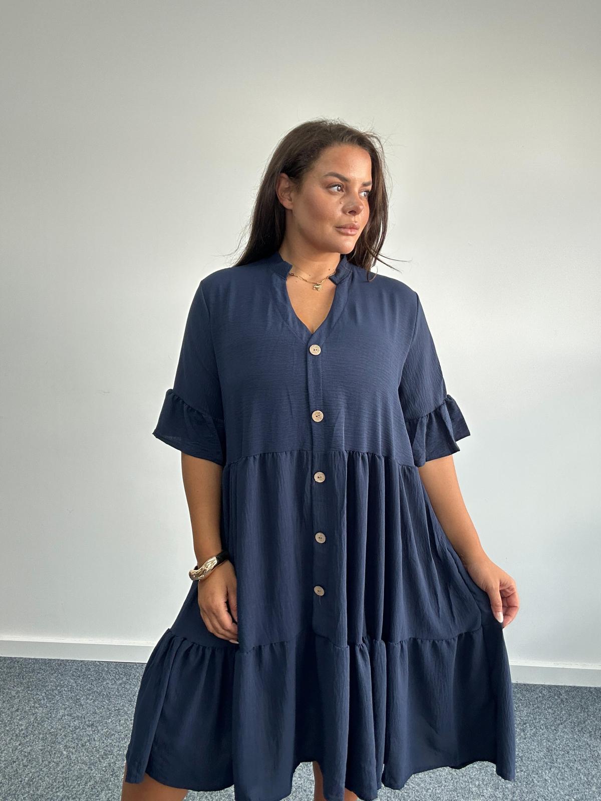 Elevate your wholesale curve and plus size range with this chic black smock dress. Designed in a flattering tiered silhouette, this dress features a v-neck, button-front fastening, and 3/4 length roll tab sleeves. The relaxed fit and lightweight fabric ensure all day comfort while still delivering effortless style. Perfect for casual days, workwear, or dressed-up evenings, this versatile piece is a wardrobe must have for plus size customers seeking comfort and elegance.