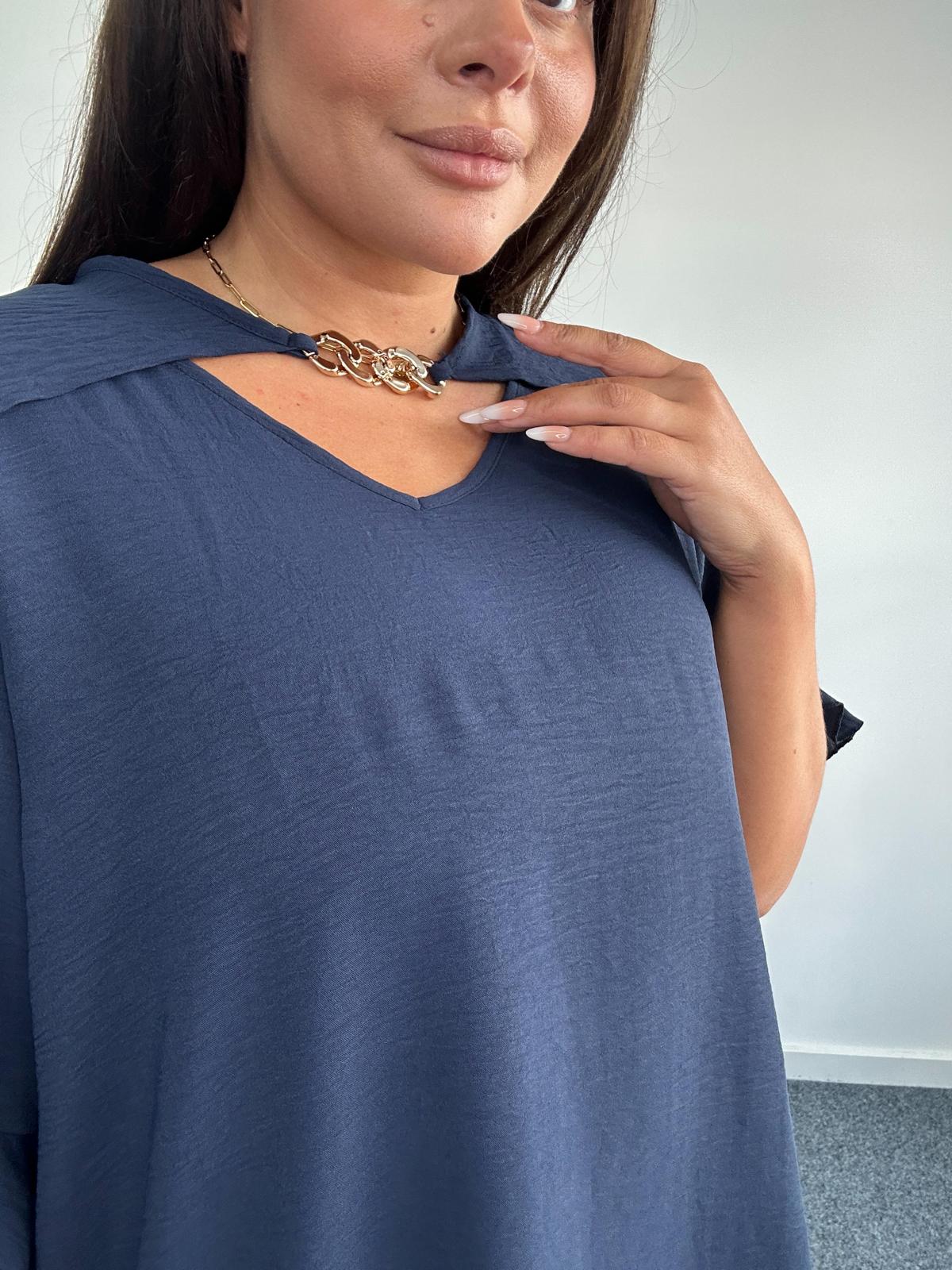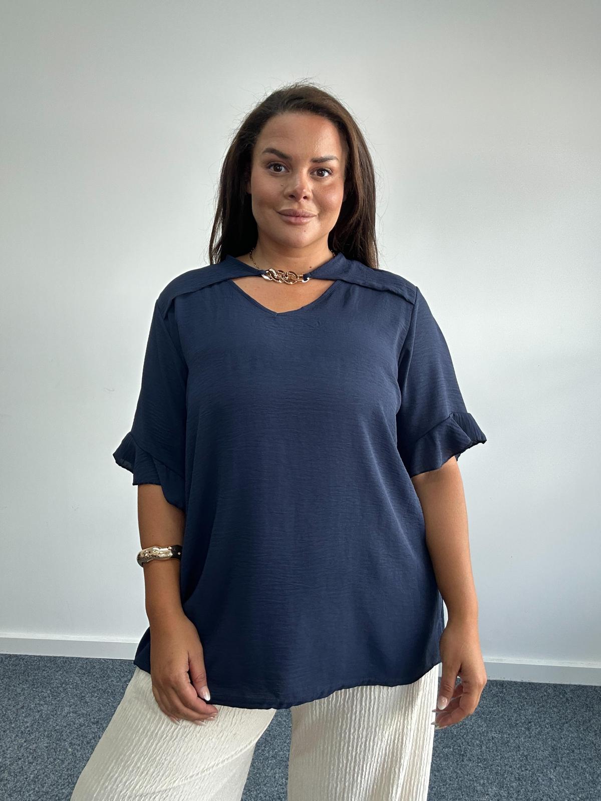 Upgrade your wholesale plus size fashion offering with this statement top, tailored for curve and plus size customers. This relaxed fit piece features a soft, breathable fabric and a unique keyhole neckline accentuated with gold tone chain detailing for a touch of glamour. Short sleeves and a flattering drape make it a versatile choice for casual, work, or evening wear. Designed to combine comfort with elevated style, this top is a must-have for any plus size retail collection.