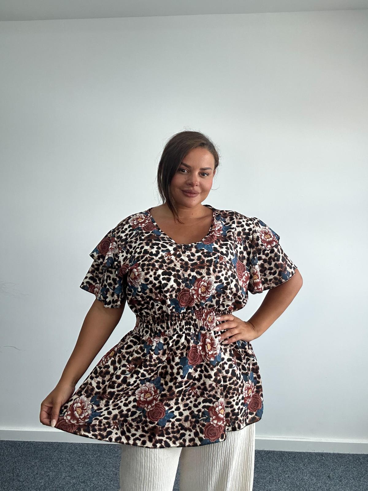 Curve Plus Size Brown Animal & Floral Print Smock Top with Ruffle Sleeves x 2, 3 & 5 Pack Options