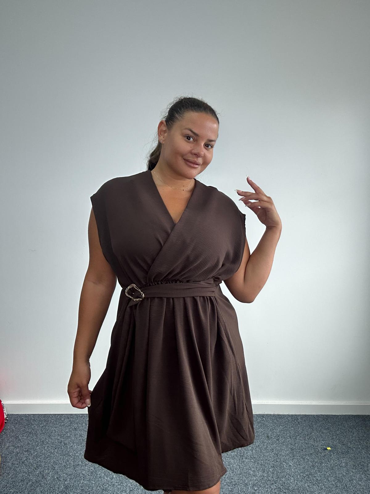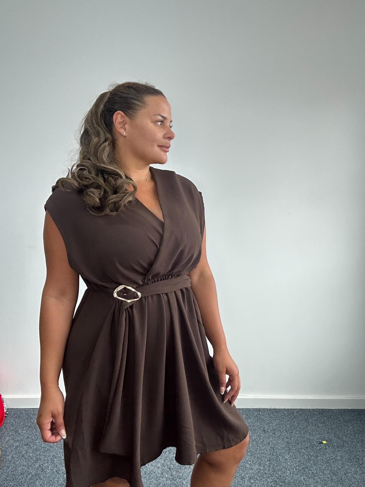 Flatter your curves with this effortlessly chic Plus Size Brown Belted Dress. Designed in a wrap-look silhouette, it features a soft v-neckline, elasticated waist, and a detachable belt with gold buckle detail to accentuate the waistline. The flowy skirt and cap sleeves offer ease and movement, making this a go-to option for day-to-night dressing. Whether styled with sandals or dressed up with heels, this mini dress brings versatile style to every curve wardrobe.