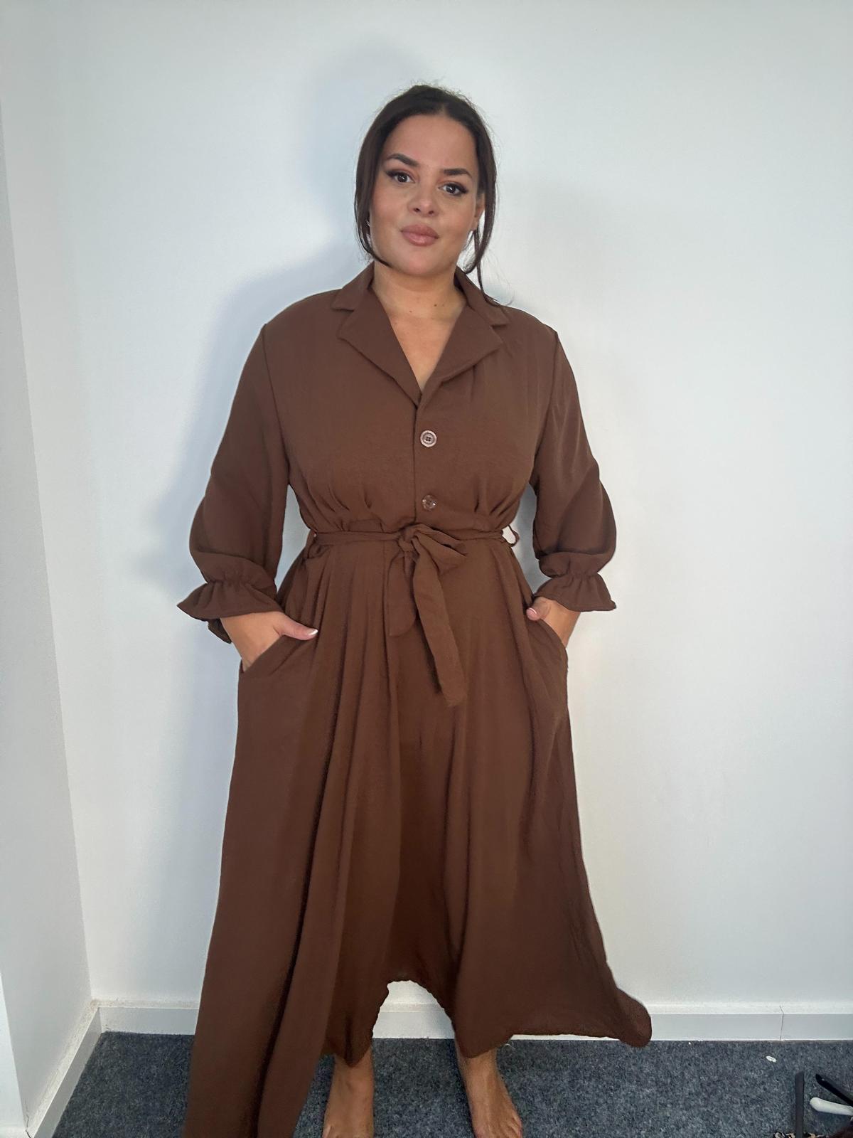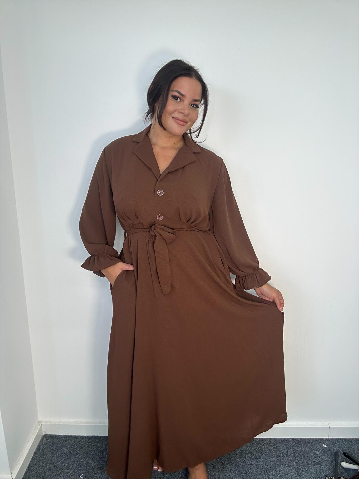 The Curve Belted Maxi Shirt Dress is a timeless and versatile piece designed to flatter plus-size silhouettes. Crafted in a flowing fabric, it features a button-front shirt style with a classic collar, long sleeves with ruffle cuff detail, and a detachable self-tie belt to cinch the waist. With hidden side pockets and a full-length hemline, this dress offers effortless elegance that transitions seamlessly from day to evening wear.