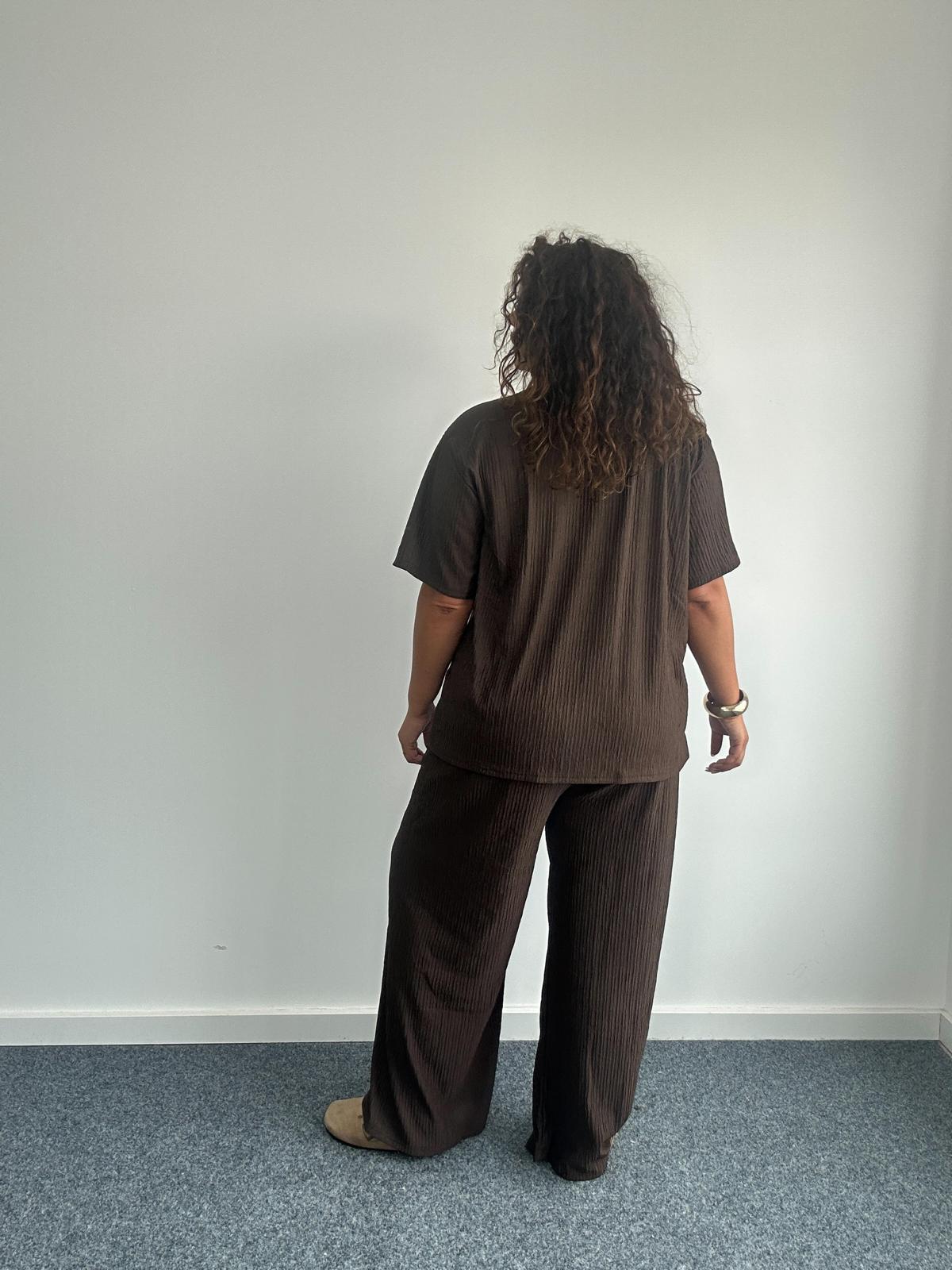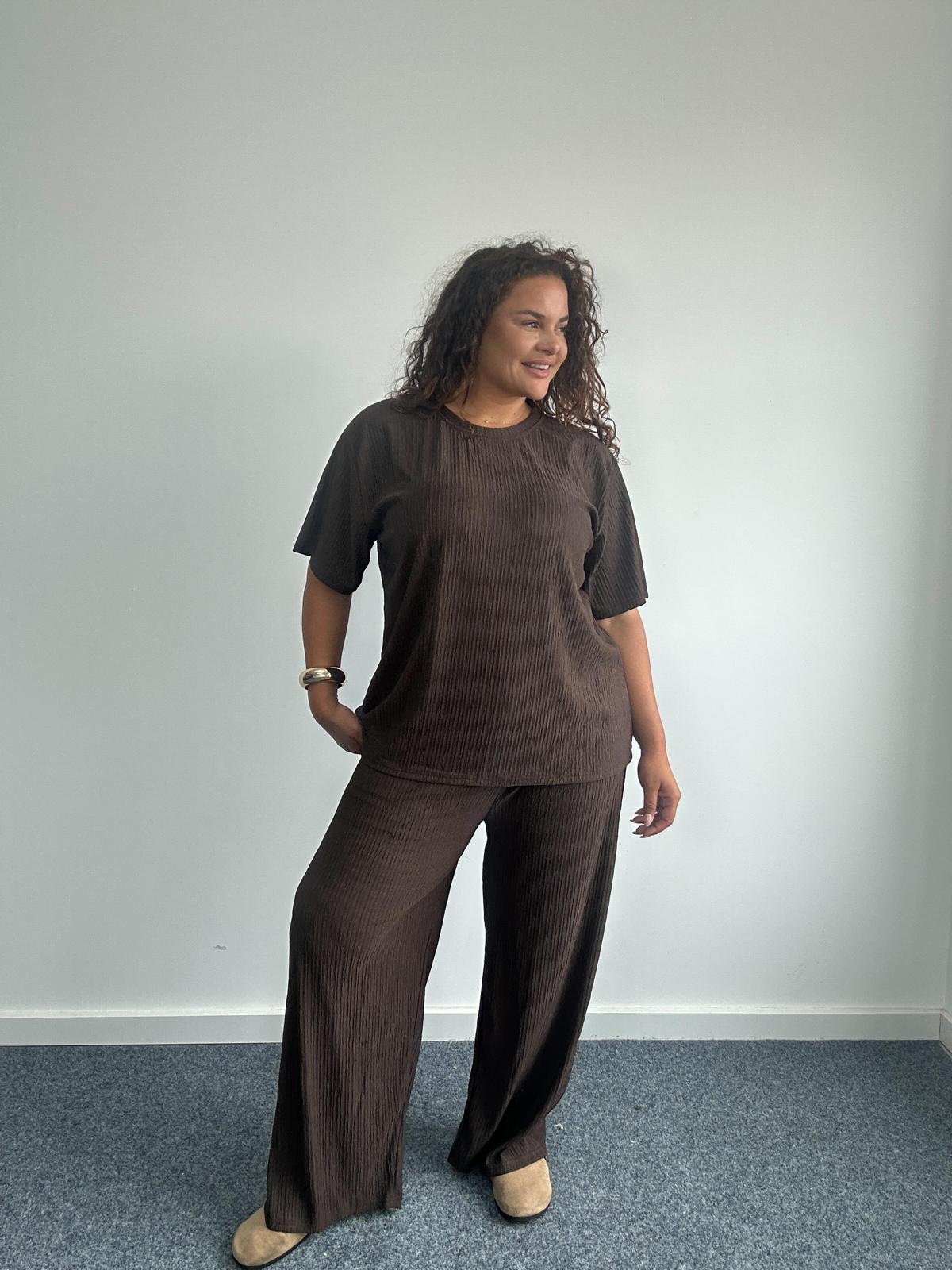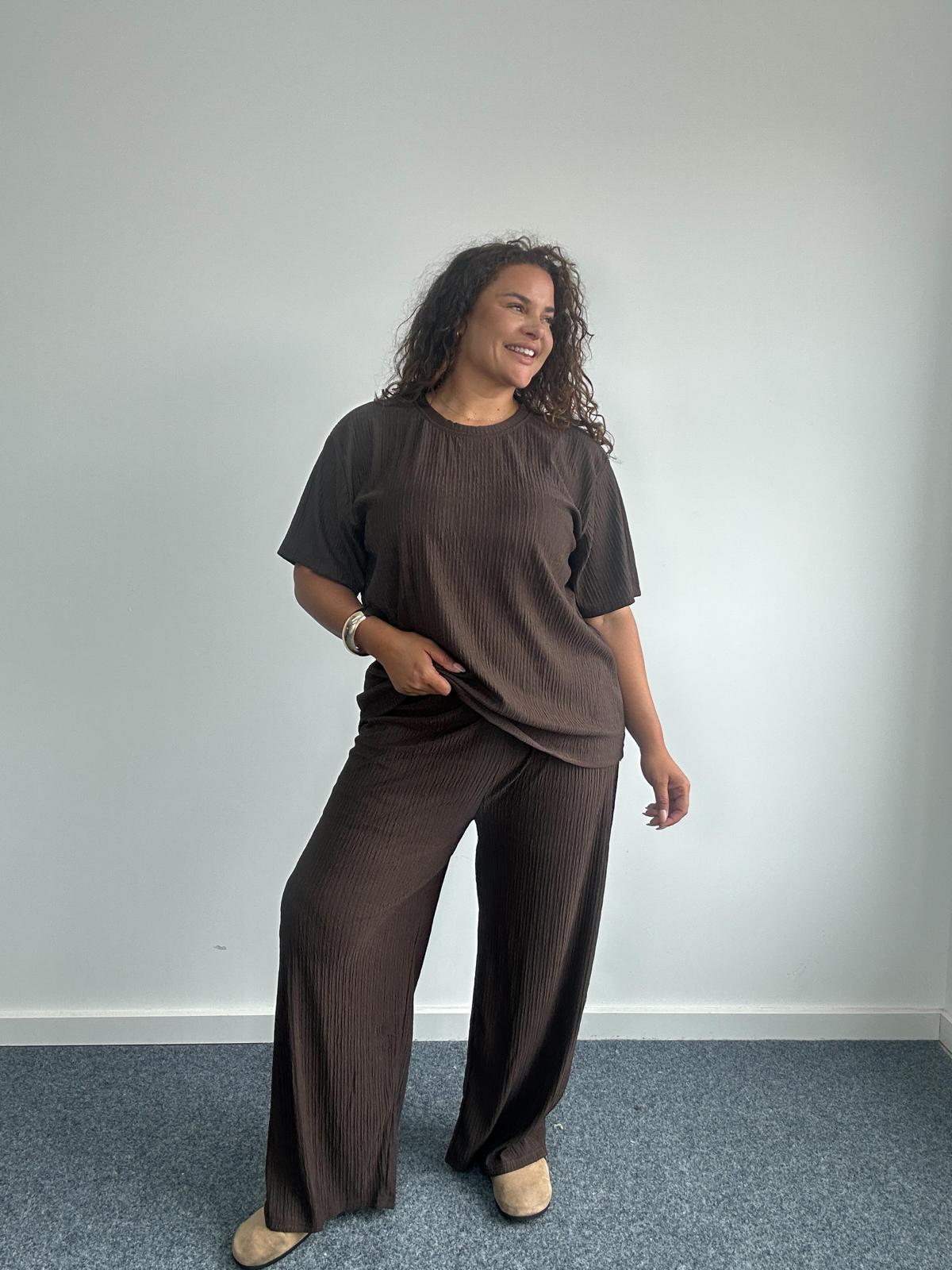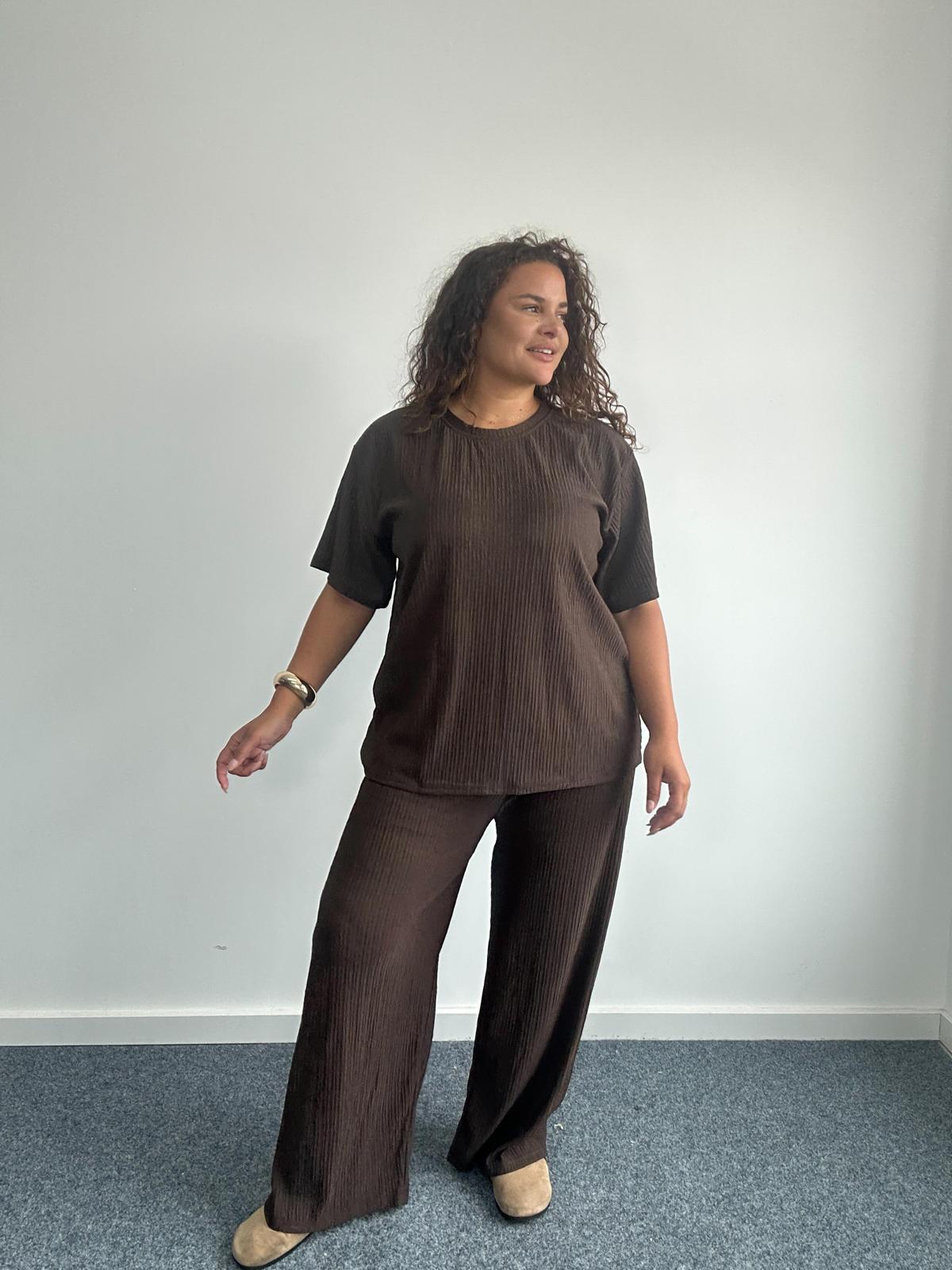 Curve Plus Size Brown Crinkle Co-Ord Set Oversized T-Shirt & Wide-Leg Trousers x 6