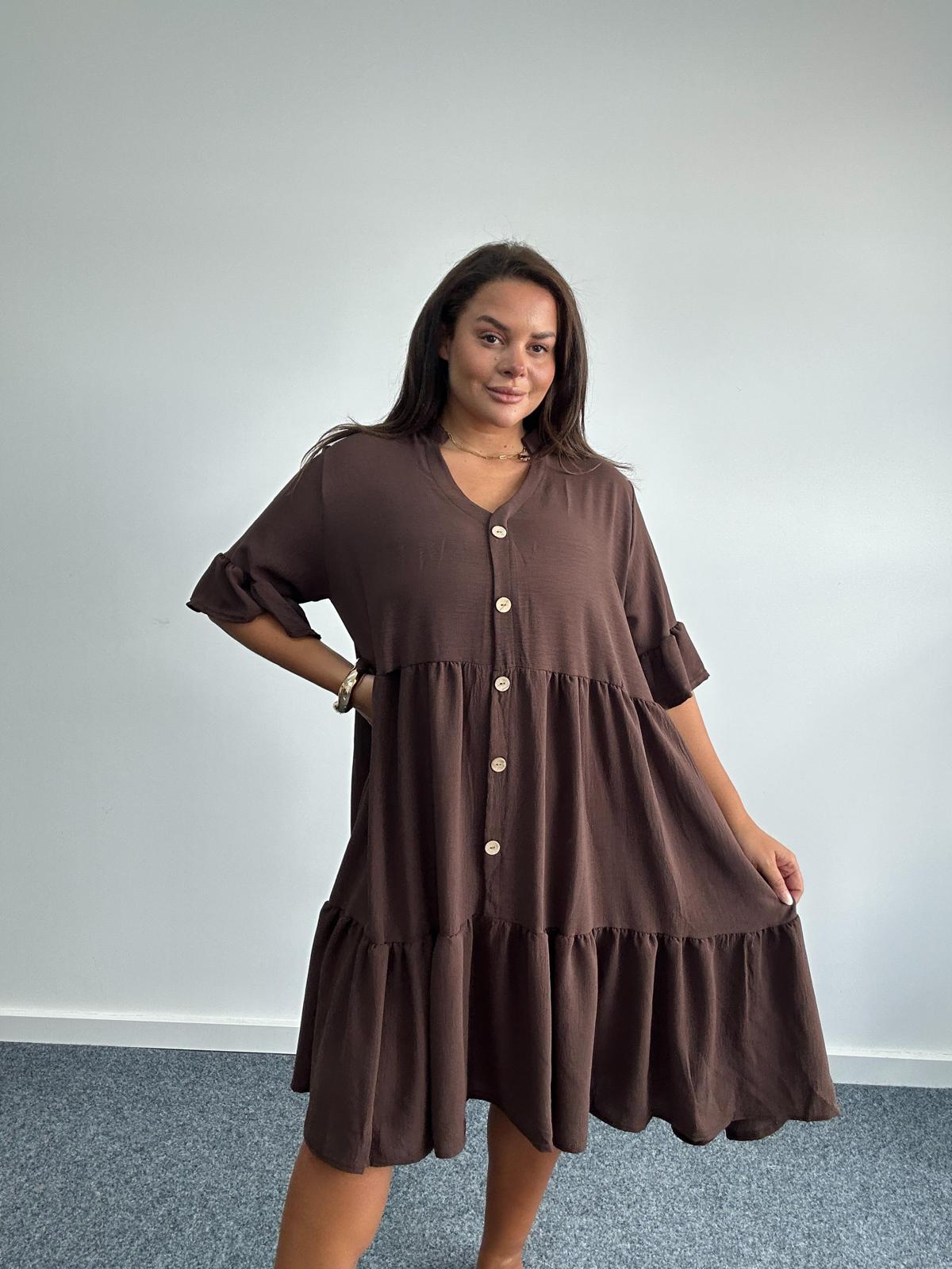 Elevate your wholesale curve and plus size range with this chic brown smock dress. Designed in a flattering tiered silhouette, this dress features a v-neck, button-front fastening, and 3/4 length roll tab sleeves. The relaxed fit and lightweight fabric ensure all day comfort while still delivering effortless style. Perfect for casual days, workwear, or dressed-up evenings, this versatile piece is a wardrobe must have for plus size customers seeking comfort and elegance.