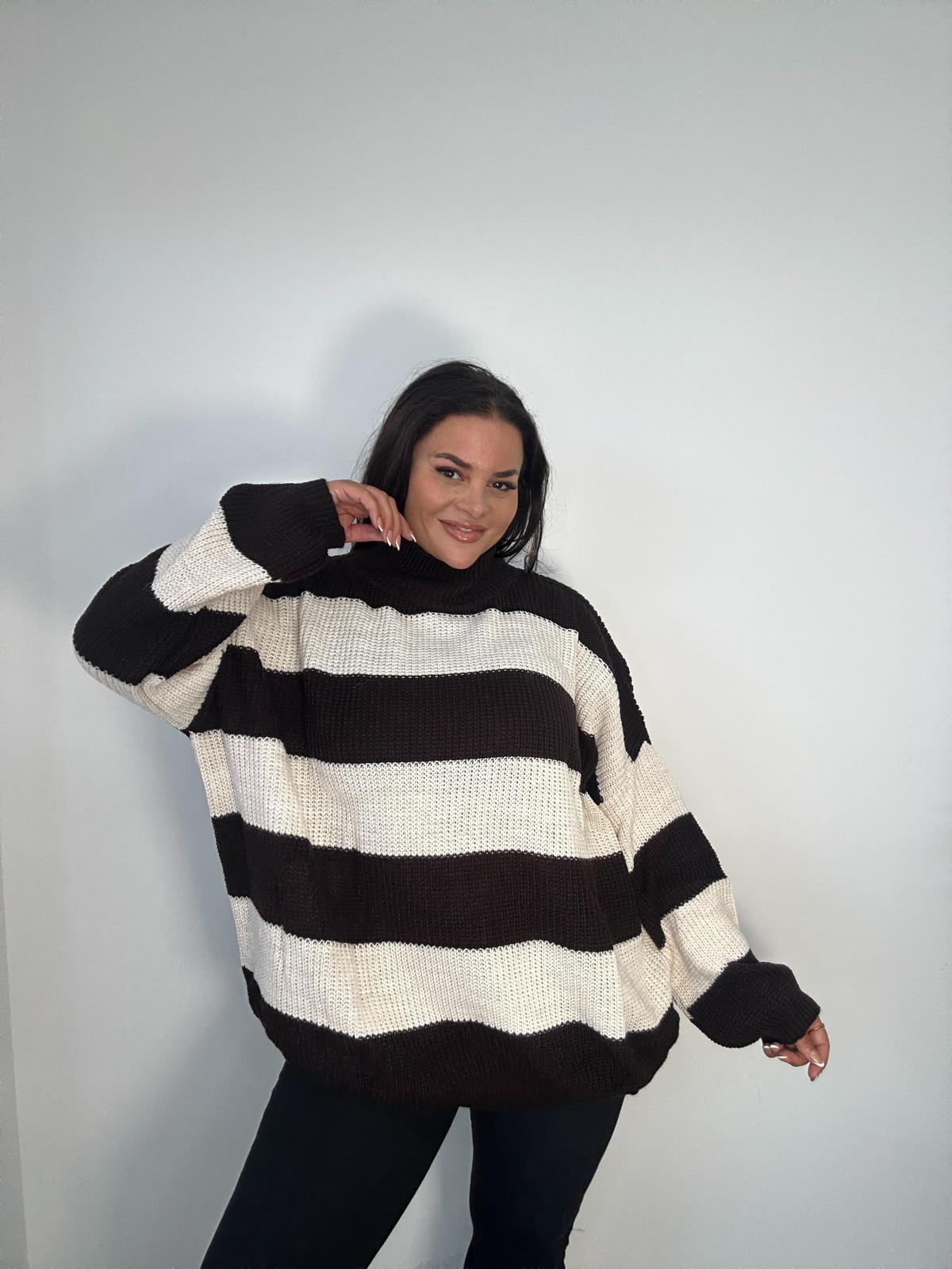 The Curve Cosy Striped Oversized Jumper is the perfect blend of comfort and style. Designed with wide monochrome stripes, this chunky knit jumper features a relaxed oversized fit, drop shoulders, and a high neckline for added warmth. Ideal for layering, it pairs effortlessly with jeans, leggings, or faux leather trousers. A must-have staple for plus-size women’s fashion collections that prioritise both cosiness and chic appeal.