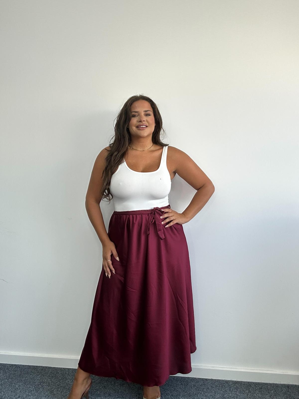 This Curve Plus Size Burgundy Midi Skirt offers a perfect blend of comfort and elegance for any occasion. Crafted from a lightweight, flowy fabric, it drapes beautifully over curves while providing all day wearability. The elasticated waistband with matching tie detail allows for a flexible fit. Ideal for pairing with blouses, knitwear, or casual tops, this skirt is a versatile must-have for your wholesale collection.