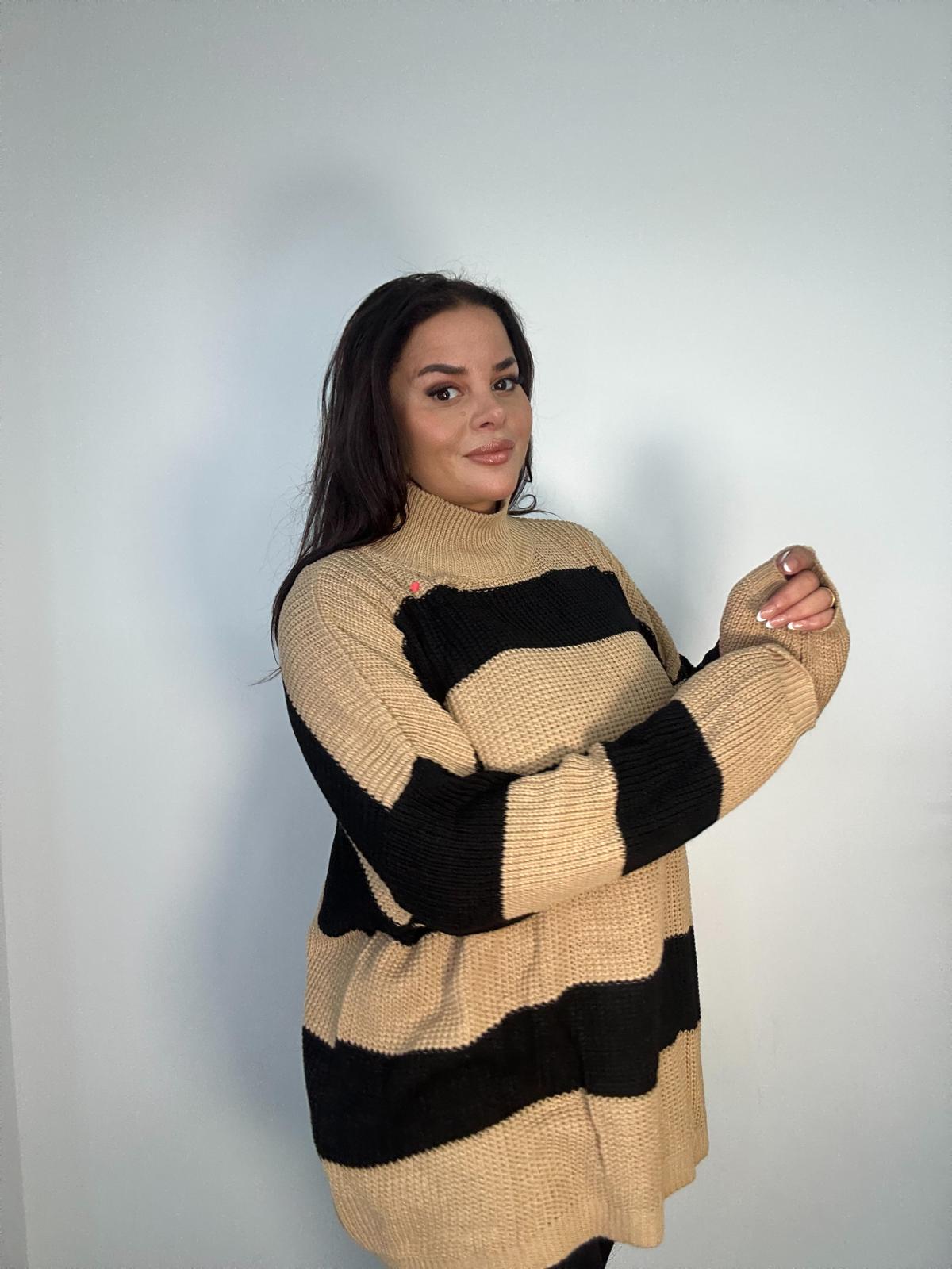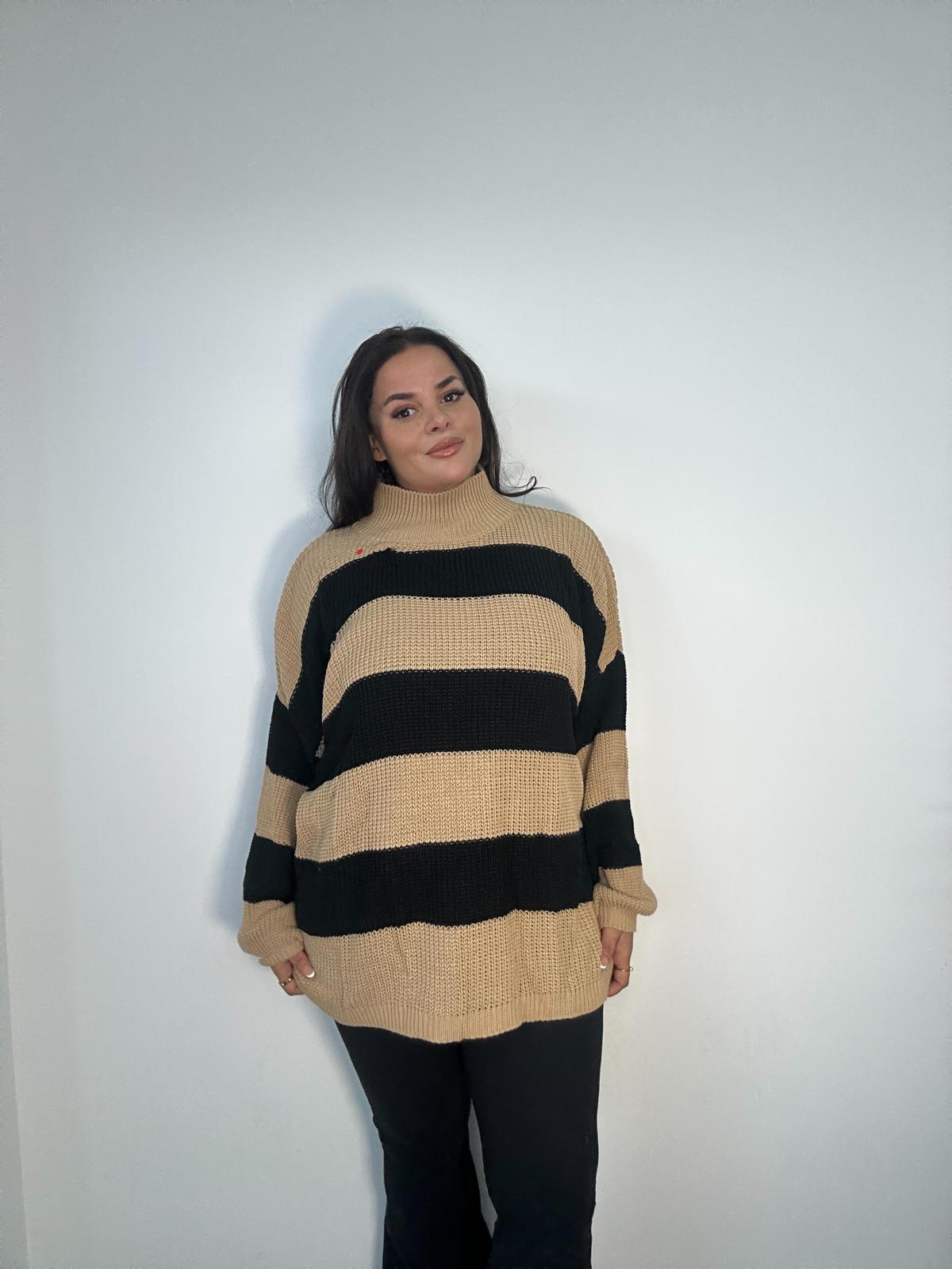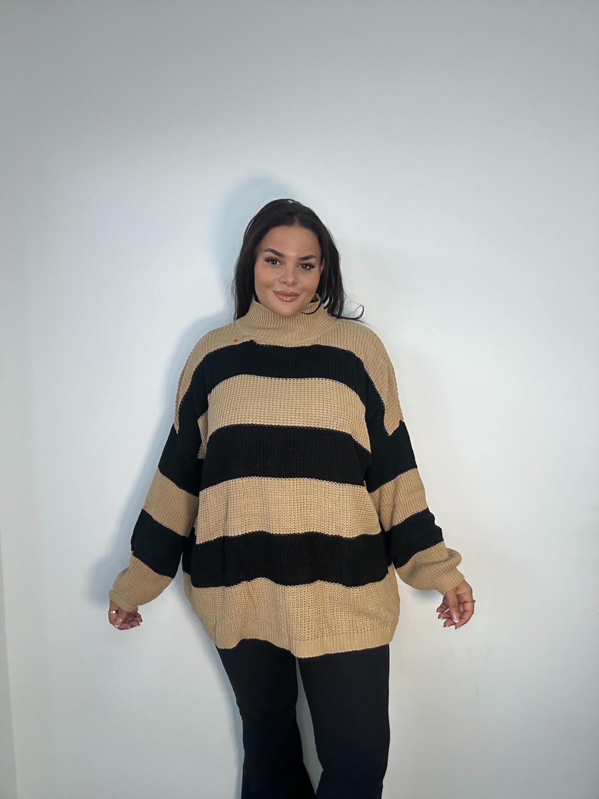 The Curve Cosy Striped Oversized Jumper is the perfect blend of comfort and style. Designed with wide monochrome stripes, this chunky knit jumper features a relaxed oversized fit, drop shoulders, and a high neckline for added warmth. Ideal for layering, it pairs effortlessly with jeans, leggings, or faux leather trousers. A must-have staple for plus-size women’s fashion collections that prioritise both cosiness and chic appeal.