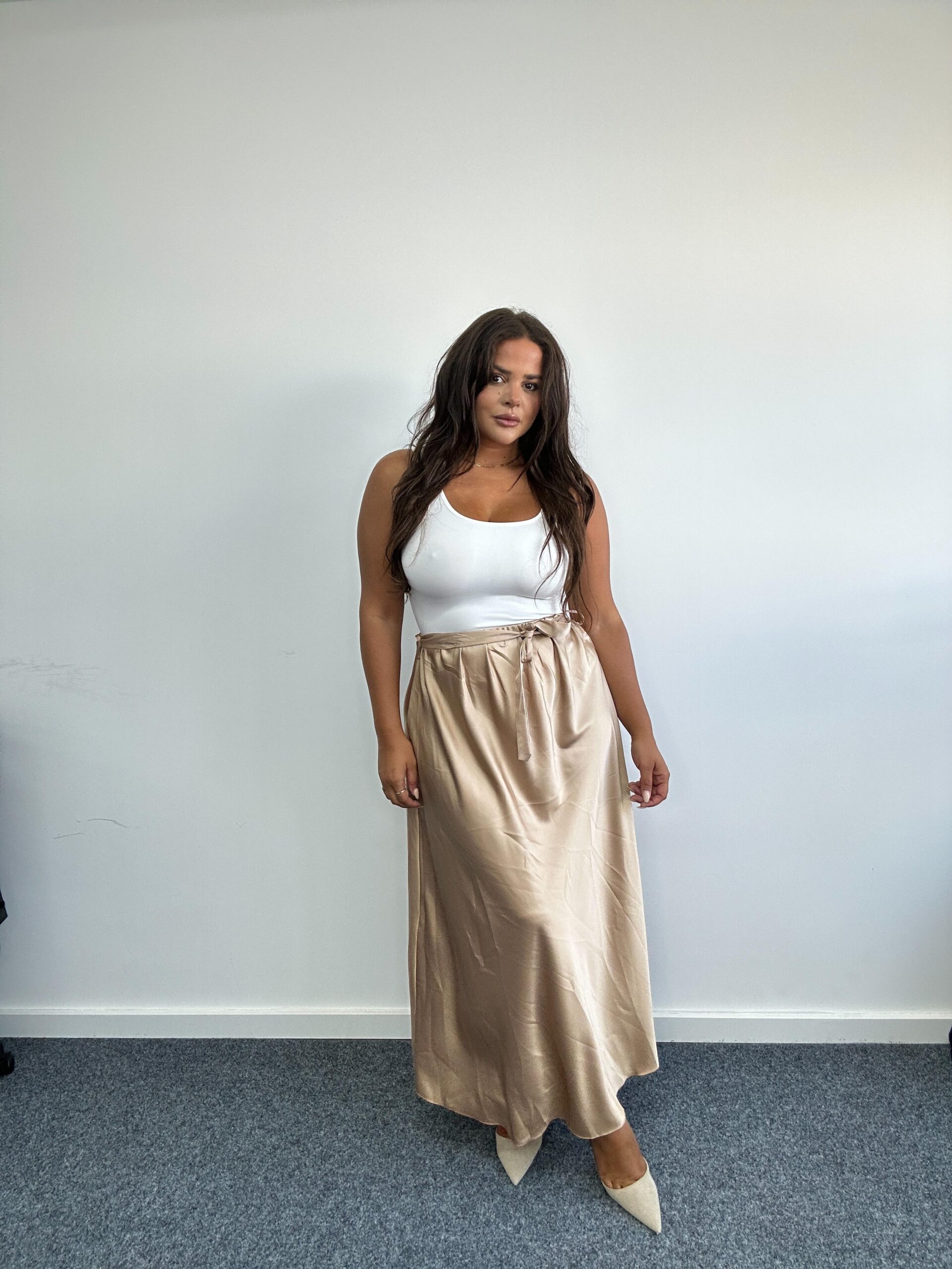 This Curve Plus Size Champagne Midi Skirt offers a perfect blend of comfort and elegance for any occasion. Crafted from a lightweight, flowy fabric, it drapes beautifully over curves while providing all day wearability. The elasticated waistband with matching tie detail allows for a flexible fit. Ideal for pairing with blouses, knitwear, or casual tops, this skirt is a versatile must-have for your wholesale collection.
