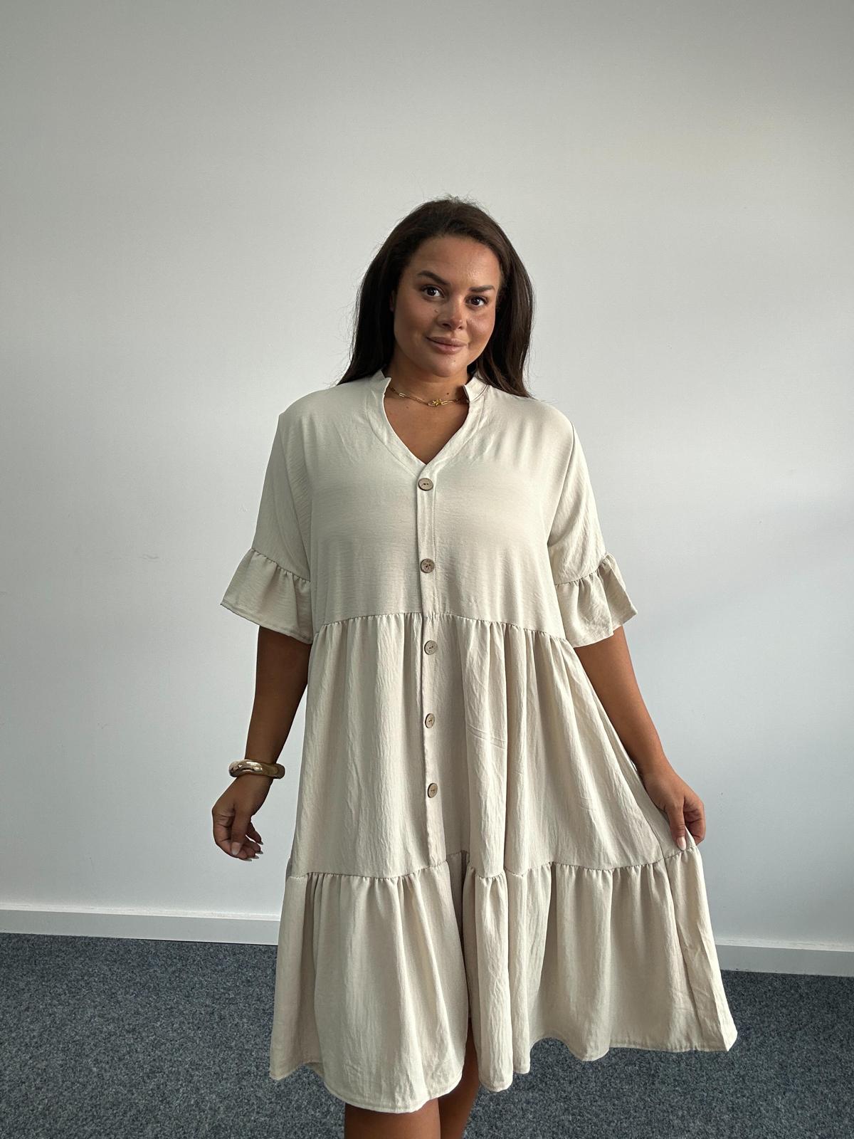 Elevate your wholesale curve and plus size range with this chic cream smock dress. Designed in a flattering tiered silhouette, this dress features a v-neck, button-front fastening, and 3/4 length roll tab sleeves. The relaxed fit and lightweight fabric ensure all day comfort while still delivering effortless style. Perfect for casual days, workwear, or dressed-up evenings, this versatile piece is a wardrobe must have for plus size customers seeking comfort and elegance.