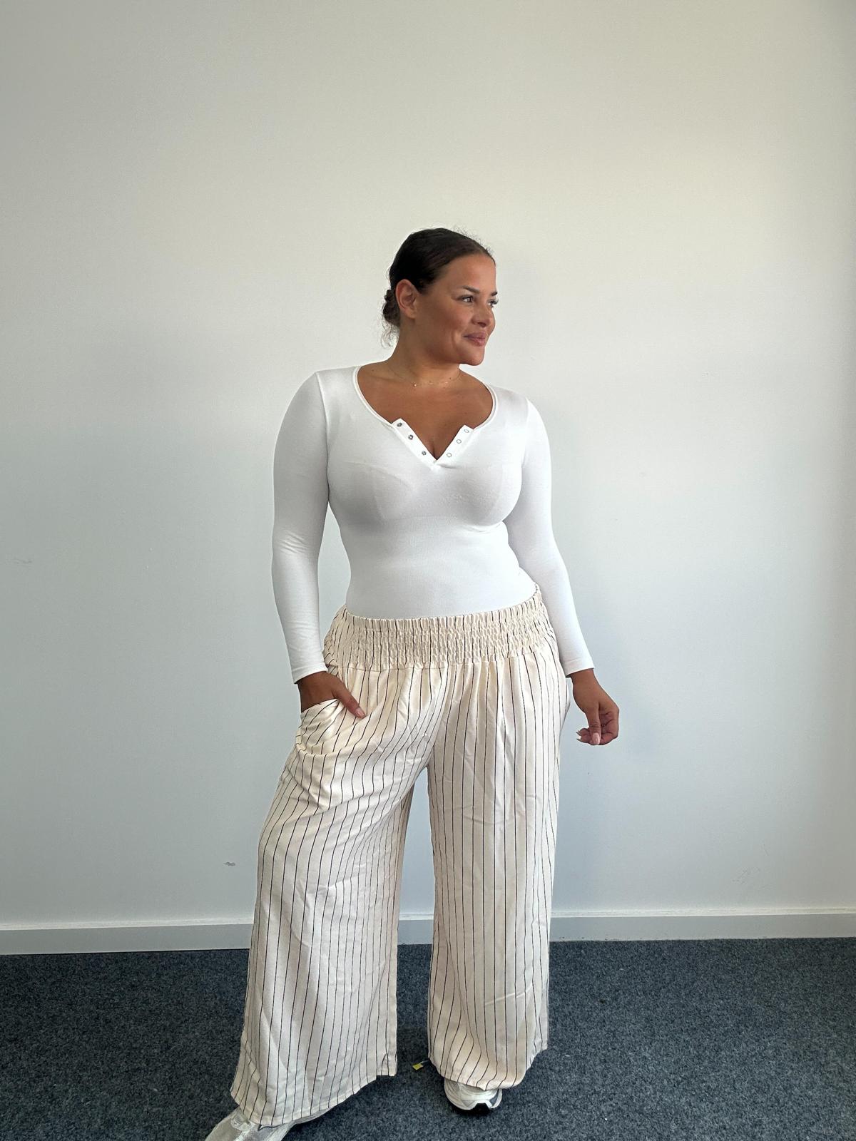 Add laid-back polish to your curve collection with these wide-leg pinstripe trousers in cream. Designed with a fully elasticated smocked waistband for all-day comfort and ease of fit, these flowy trousers offer effortless movement and a flattering silhouette. The vertical white pinstripes elongate the leg, while the side pockets bring casual practicality, ideal for smart-casual styling, holiday edits, or everyday collections.
