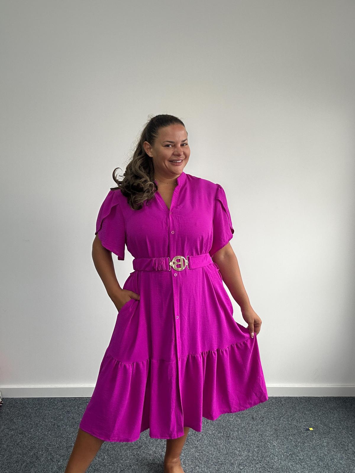 Make a statement with this bold and beautiful Plus Size Fuchsia Shirt Dress, crafted to flatter fuller silhouettes with ease and colour confidence. Featuring a full button-down front, short flutter sleeves, and a gathered tiered hem, this piece is finished with a matching stretch belt and standout gold buckle detail. Designed for versatility, this dress transitions effortlessly from daytime occasionwear to weekend style, making it a key piece for plus size collections.