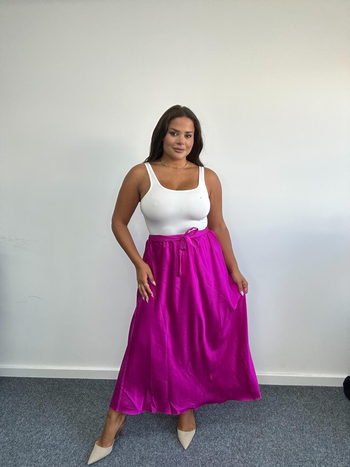 This Curve Plus Size Fuchsia Midi Skirt offers a perfect blend of comfort and elegance for any occasion. Crafted from a lightweight, flowy fabric, it drapes beautifully over curves while providing all day wearability. The elasticated waistband with matching tie detail allows for a flexible fit. Ideal for pairing with blouses, knitwear, or casual tops, this skirt is a versatile must-have for your wholesale collection.