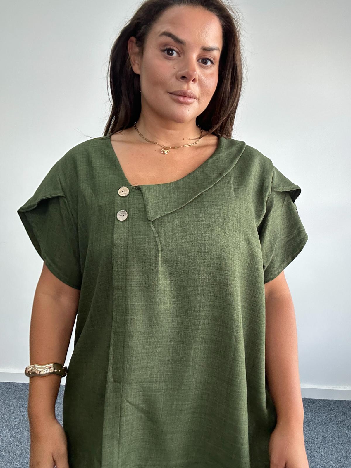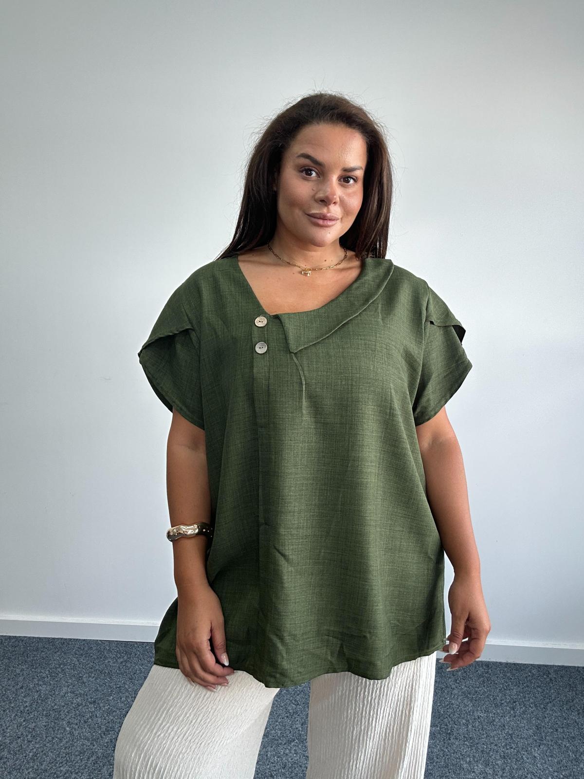 Bring contemporary style to your wholesale plus size collection with this asymmetric neckline top. Designed for curve and plus size customers, this relaxed fit blouse features a unique slanted neckline with decorative button accents, short sleeves, and a flowing silhouette for maximum comfort. The lightweight fabric drapes beautifully, making it perfect for everyday wear, office outfits, or smart casual occasions. A versatile addition that flatters different body types while staying effortlessly chic.