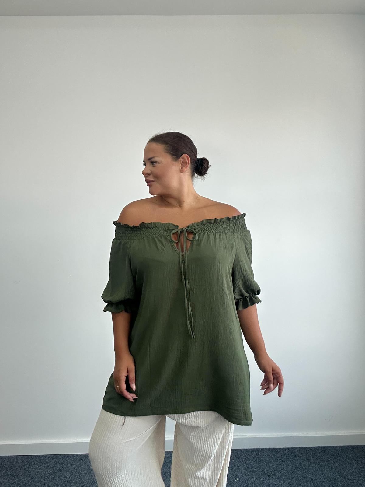 Bring vibrant energy to your plus-size range with this stunning khaki off-shoulder top. Featuring a smocked neckline and tie-front detail, this top blends feminine charm with laid-back elegance. The soft crinkle fabric and flowy silhouette ensure a breathable, flattering fit, perfect for holiday edits, summer styling, or boho-inspired collections.