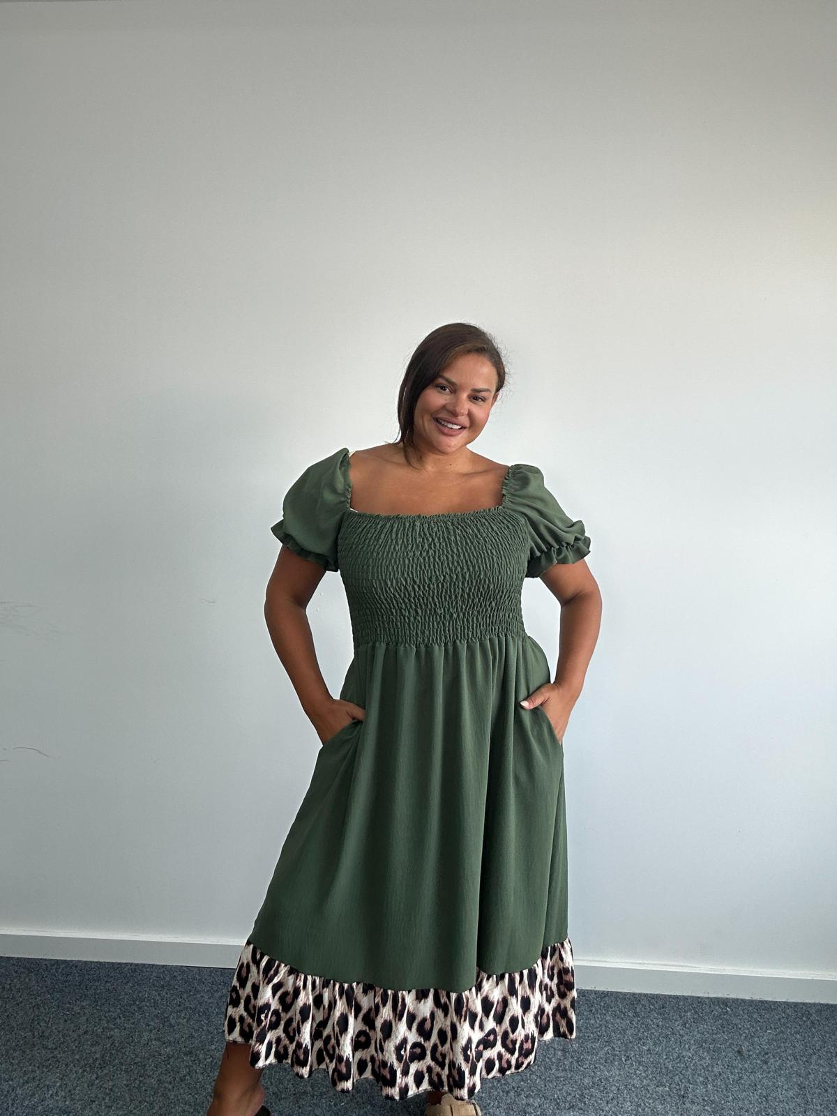 Curve Plus Size Khaki Leopard Hem Smock Shirred Bodice Dress with Pockets x 2, 3 & 5 Pack Options