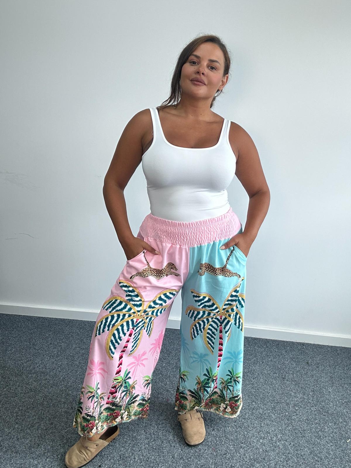 Stand out in style with these Curve Plus Size Wide Leg Trousers, designed with a striking mixed print pattern. Crafted from lightweight, flowy fabric, these trousers offer a relaxed fit with an elasticated waistband for all-day comfort. The wide-leg silhouette creates effortless movement, making them perfect for casual summer wear, holidays, or statement looks. A must-have piece for bold fashion lovers.