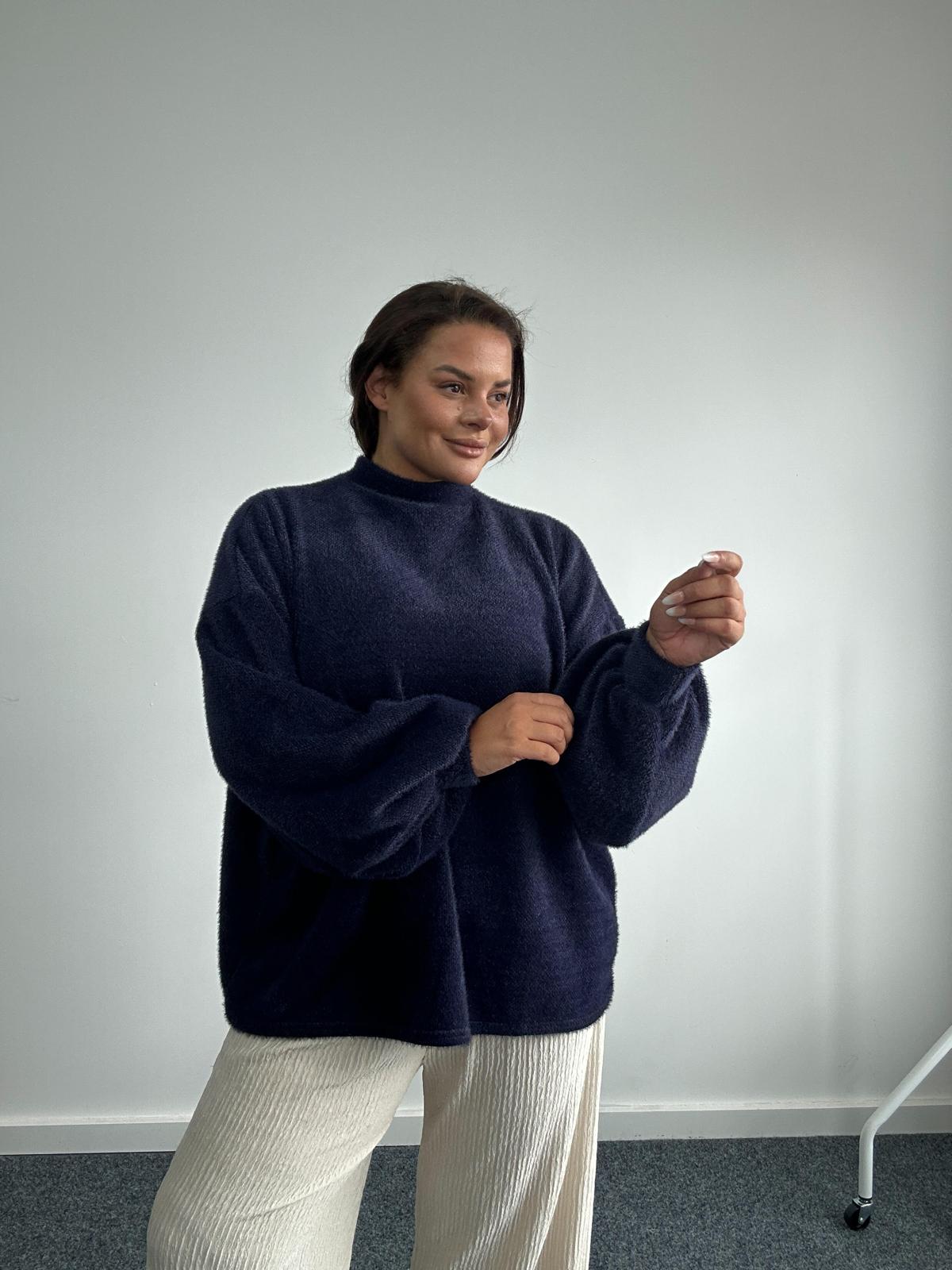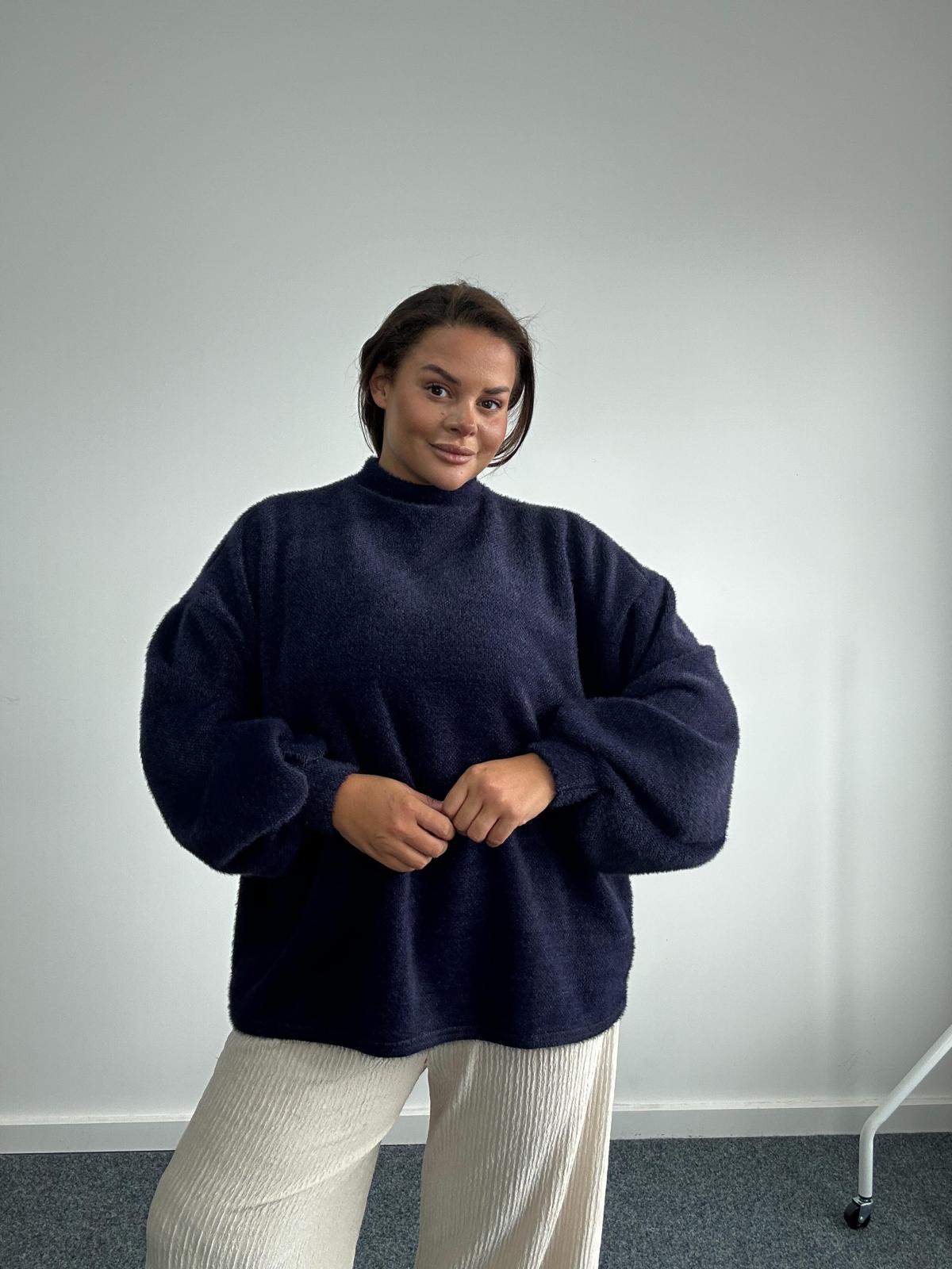 Introduce cosy sophistication into your wholesale plus size knitwear collection with this navy fluffy jumper. Designed in a relaxed oversized fit, this jumper features a high neckline and statement balloon sleeves, offering both comfort and a stylish silhouette. Crafted from a soft, textured knit, it’s the perfect layering piece for cooler weather. The colour makes it versatile for casual or smart-casual styling, a must-have for plus size retailers looking to stock trendy yet timeless knitwear.