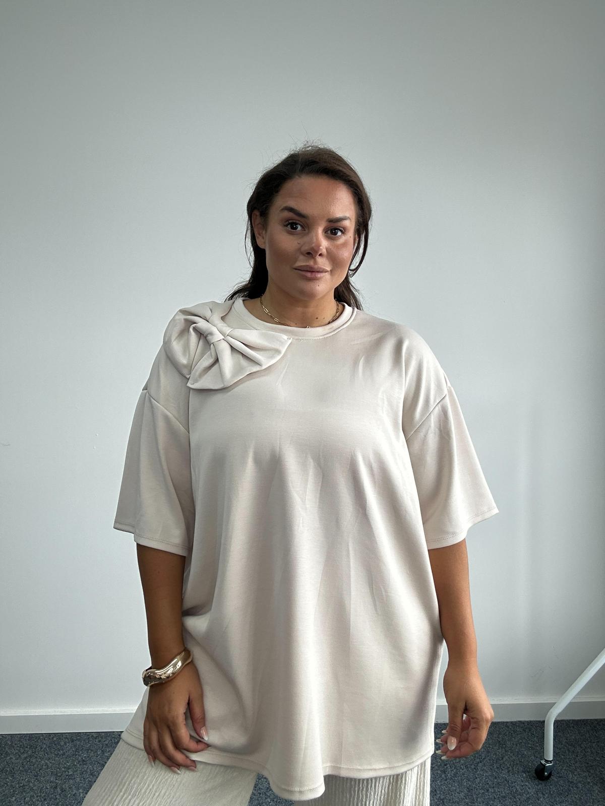 Add a touch of elegance to your wholesale plus size collection with this oversized top. Designed with a relaxed silhouette for all day comfort, this style features a round neckline, short sleeves, and a dramatic bow detail on the shoulder for a feminine twist. Perfect for customers who love versatile basics with a stylish upgrade, this piece transitions easily from casual wear to evening outings. A must-have for plus size retailers looking to offer chic yet comfortable fashion.