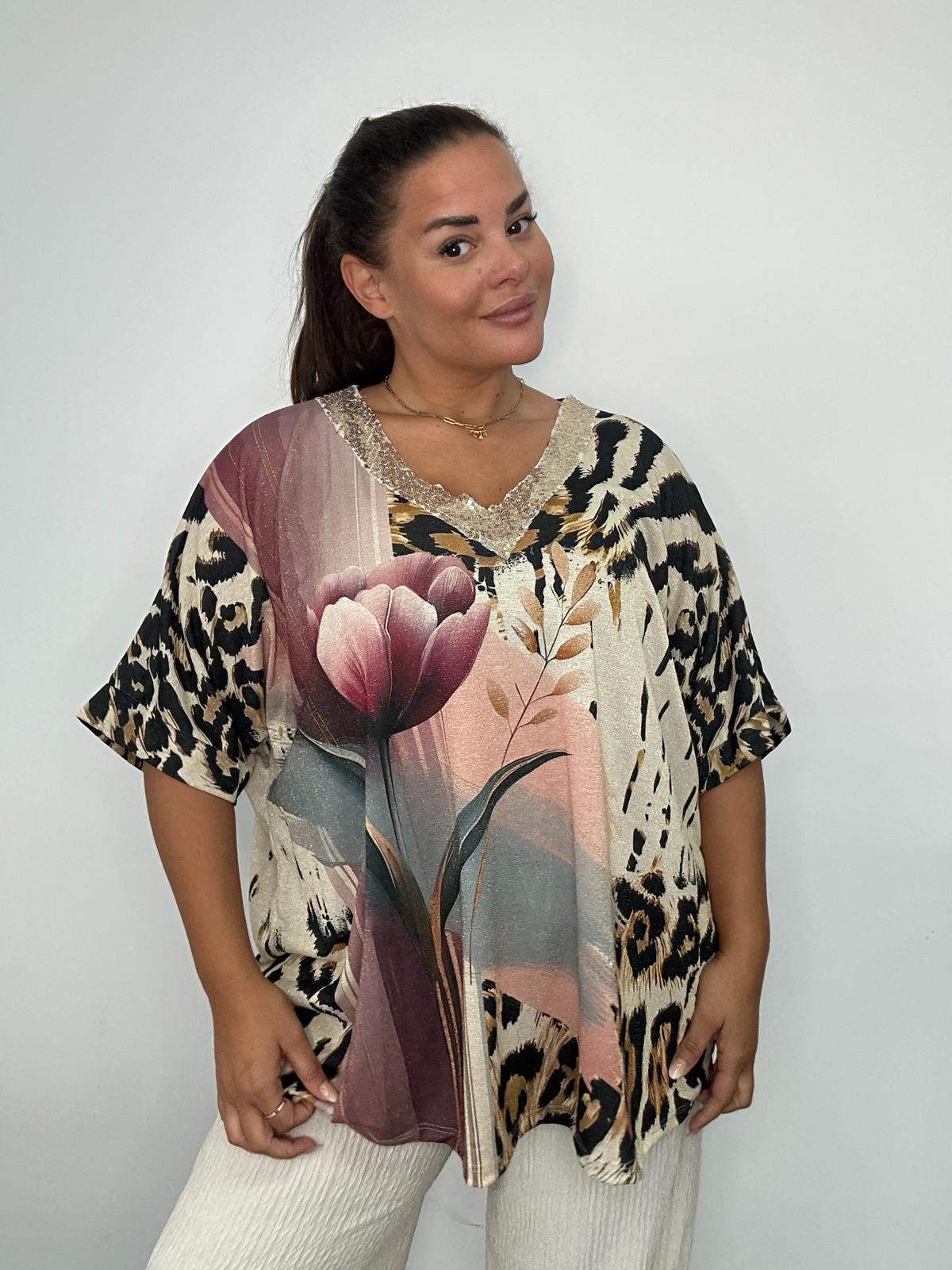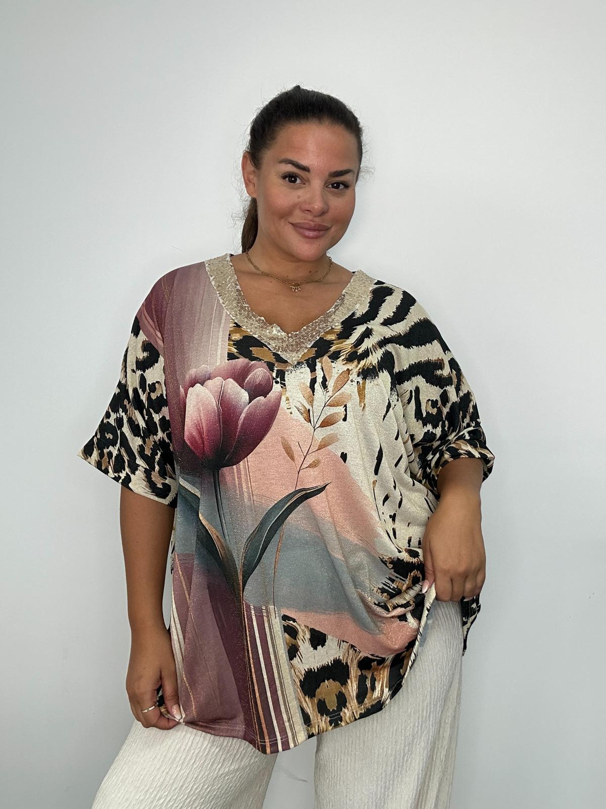 This Curve Plus Size V-Neck Top combines bold prints with a touch of sparkle for a standout look. Designed in a lightweight fabric, it features a relaxed fit with short sleeves, making it perfect for all-day wear. The eye-catching print with the sequin-trim neckline adds a hint of glamour. A versatile piece that pairs effortlessly with jeans, leggings, or skirts for casual to dressy occasions.