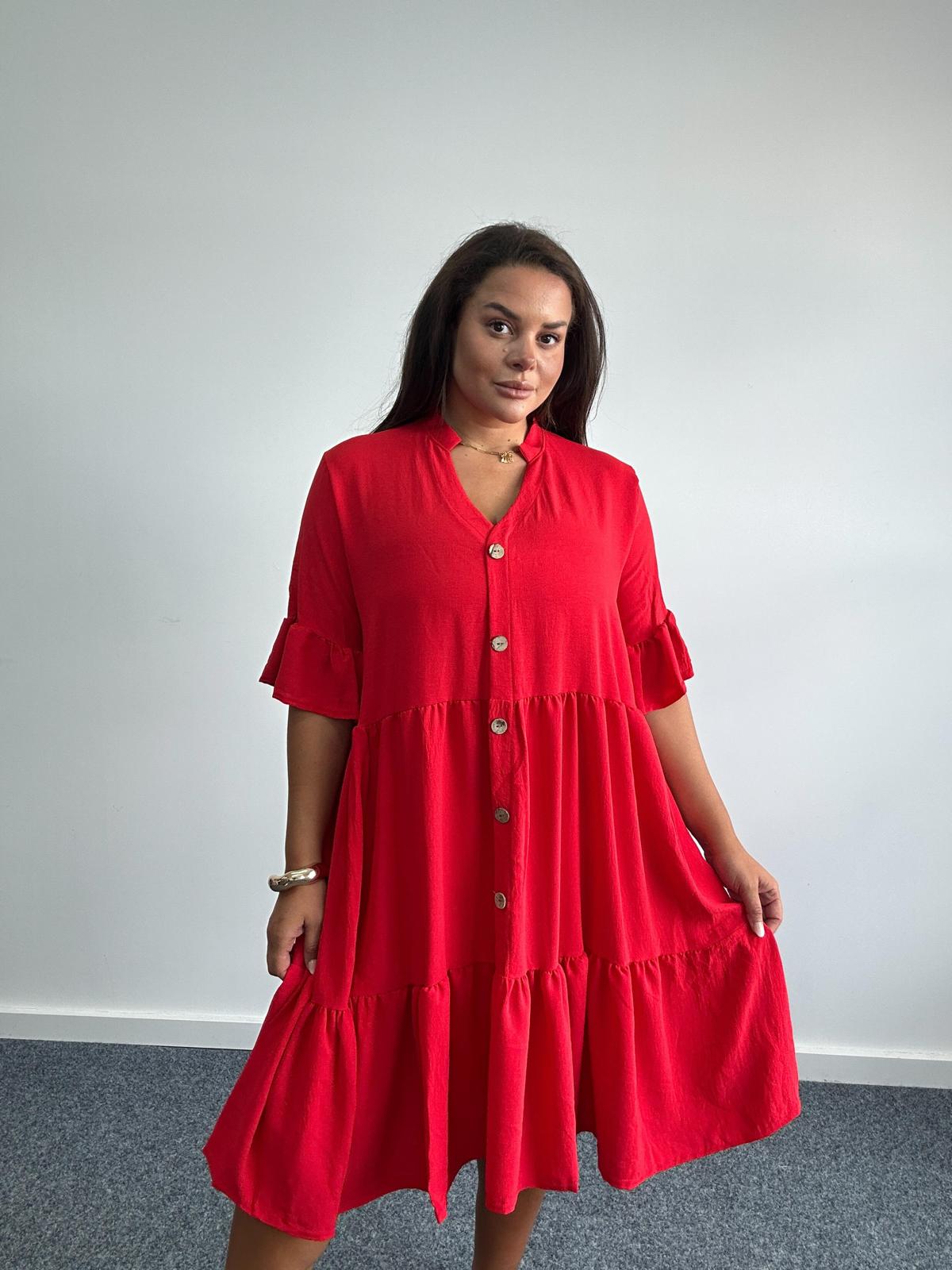 Elevate your wholesale curve and plus size range with this chic red smock dress. Designed in a flattering tiered silhouette, this dress features a v-neck, button-front fastening, and 3/4 length roll tab sleeves. The relaxed fit and lightweight fabric ensure all day comfort while still delivering effortless style. Perfect for casual days, workwear, or dressed-up evenings, this versatile piece is a wardrobe must have for plus size customers seeking comfort and elegance.