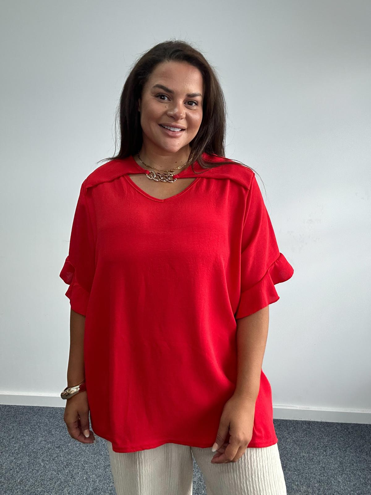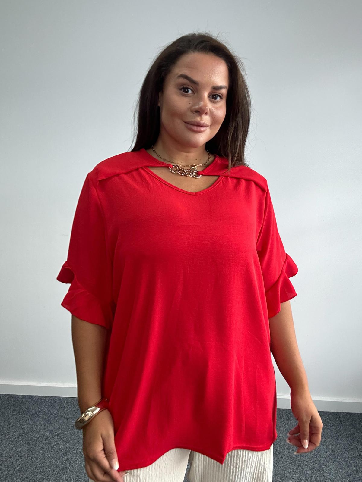 Upgrade your wholesale plus size fashion offering with this statement top, tailored for curve and plus size customers. This relaxed fit piece features a soft, breathable fabric and a unique keyhole neckline accentuated with gold tone chain detailing for a touch of glamour. Short sleeves and a flattering drape make it a versatile choice for casual, work, or evening wear. Designed to combine comfort with elevated style, this top is a must-have for any plus size retail collection.