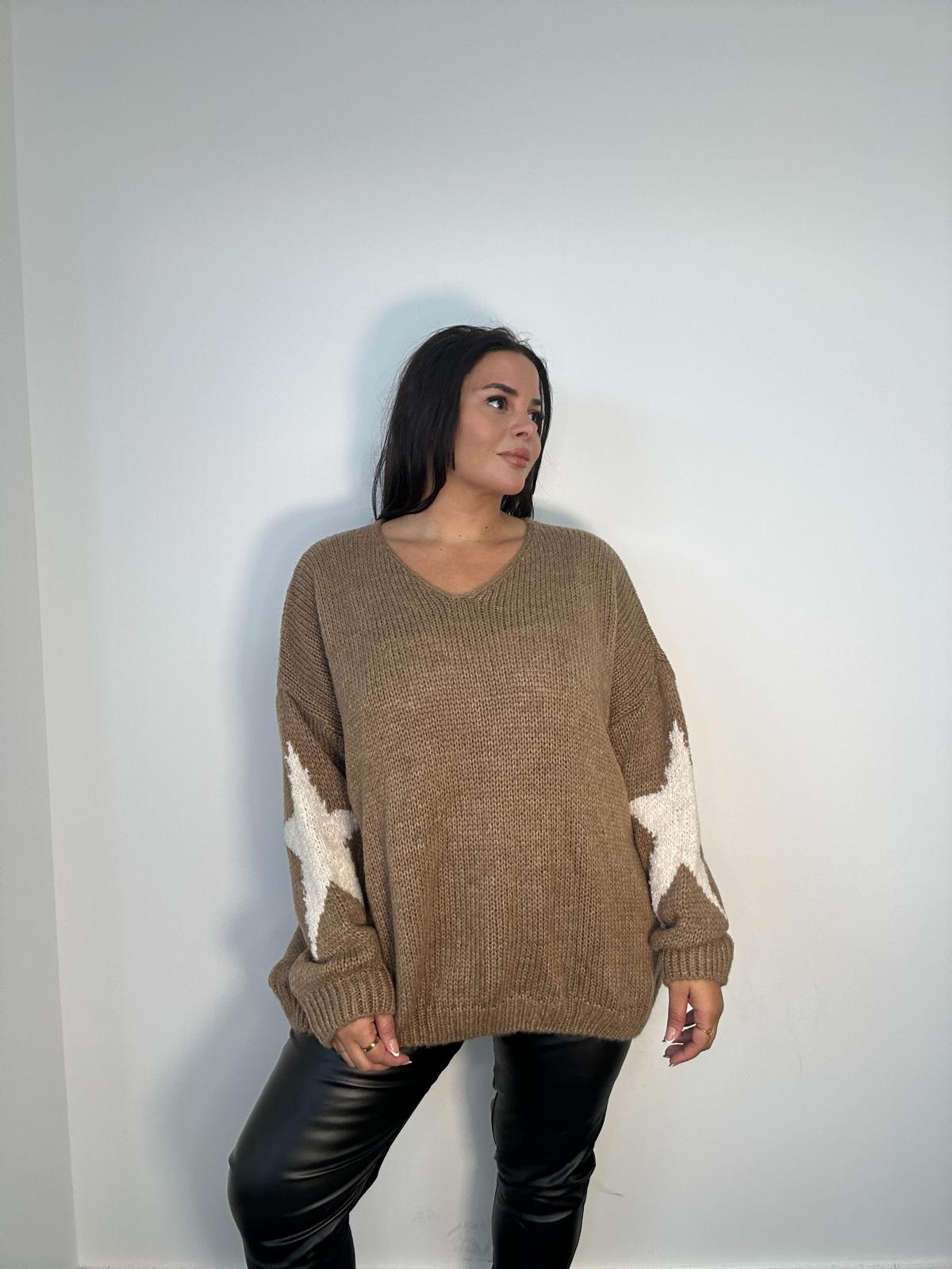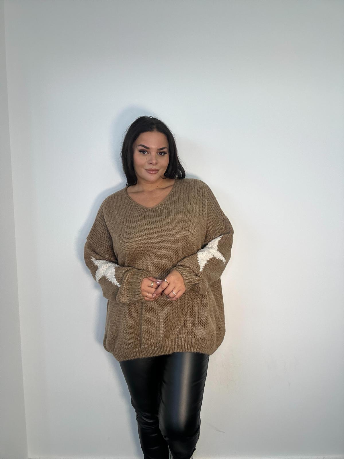 The Curve Star Sleeve Knit Jumper combines cosy comfort with playful detail. Designed in a soft knit, this jumper features a flattering v-neck, an oversized relaxed fit, and bold contrast star motifs on the sleeves. Perfect for layering with leggings, jeans, or faux leather trousers, it’s a must-have knitwear staple for plus-size collections that balances everyday wear with standout style.