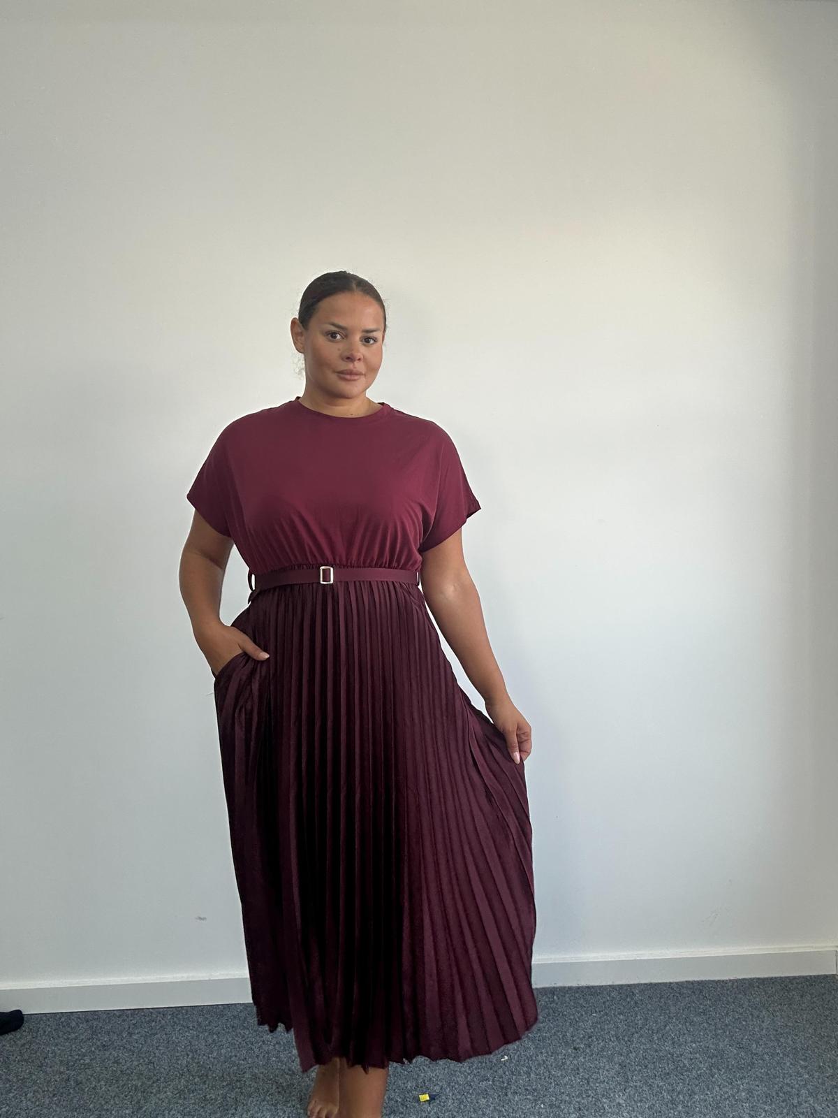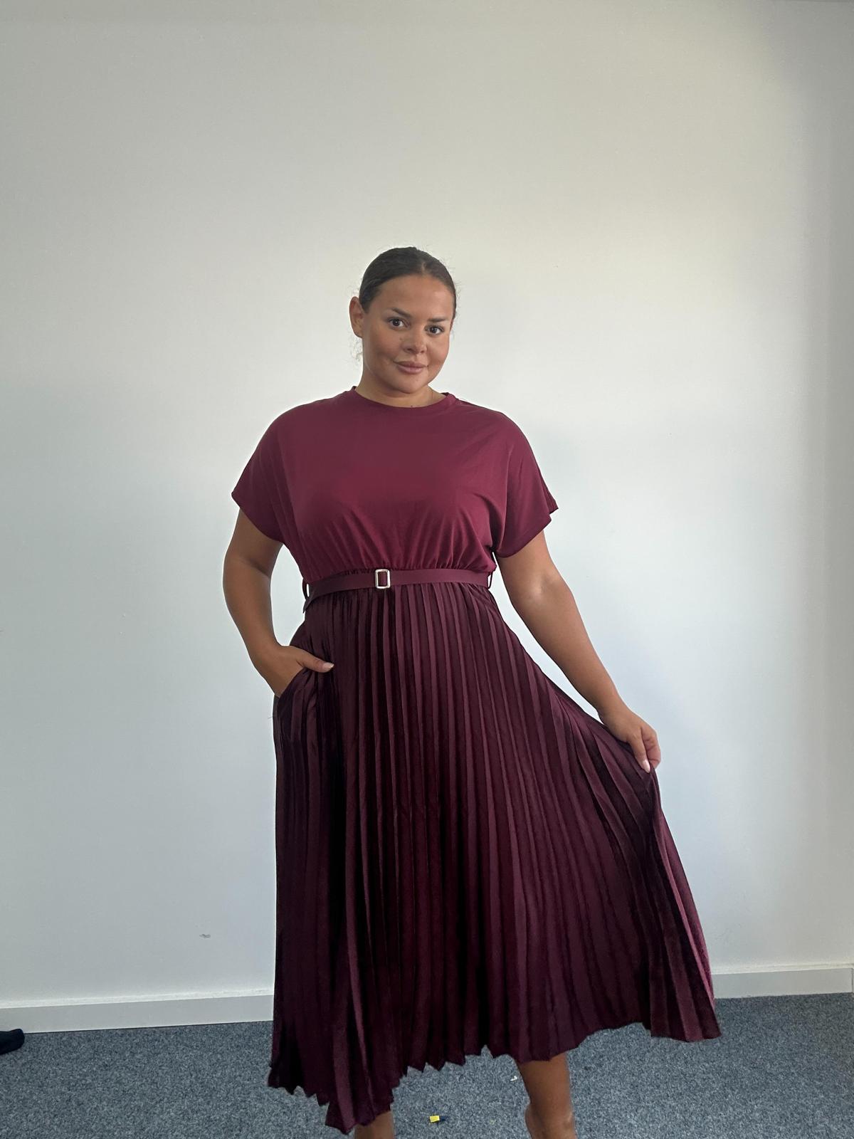 Chic, flattering, and effortlessly elegant, this curve plus size midi dress is a standout piece for any occasionwear or smart-casual collection. Featuring a soft jersey-style top with short sleeves, a matching belt to define the waist, and a beautifully pleated satin-look skirt, this dress offers both comfort and style. Ideal for day-to-night wear, special events, or capsule wardrobes.