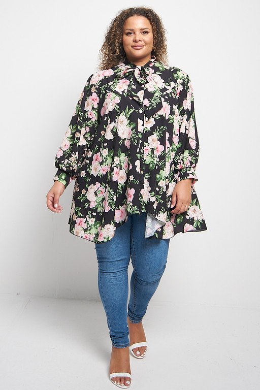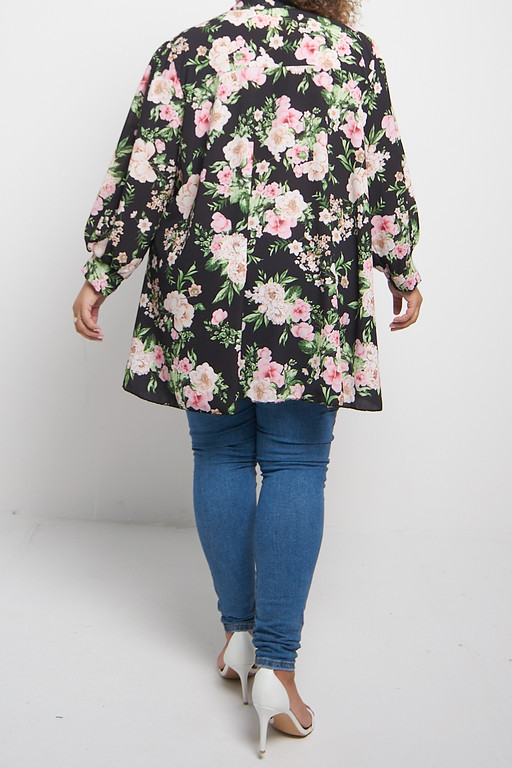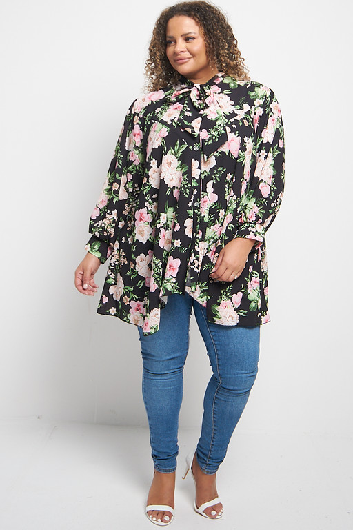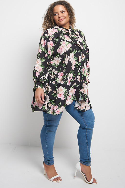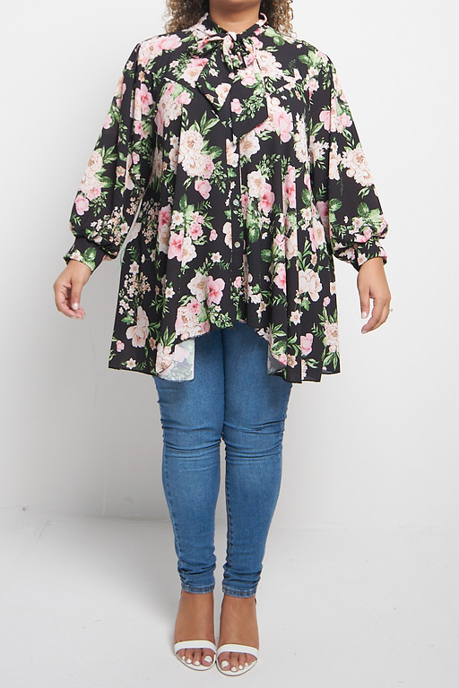 One Size Black Floral Pussy bow button front baloon sleeve asymmetric print top x 5