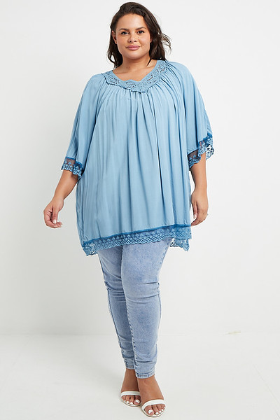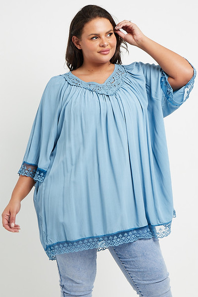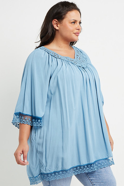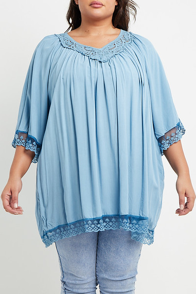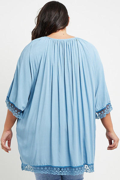 One Size Light Blue Lace Trim V Neck 3/4 Length Sleeve Top With Pockets x 5