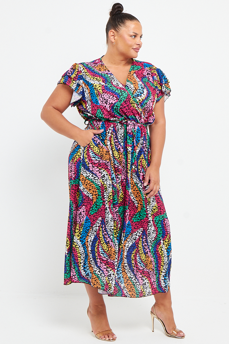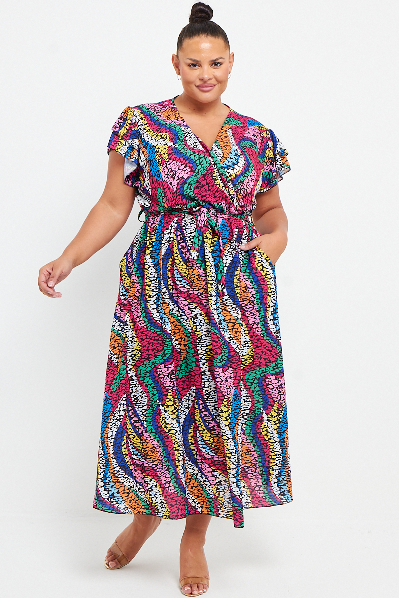 One Size Multi Print Wrap Short Sleeves Tie Waist Midi Dress With Pockets x 5