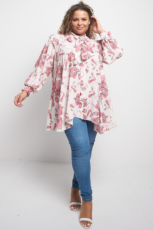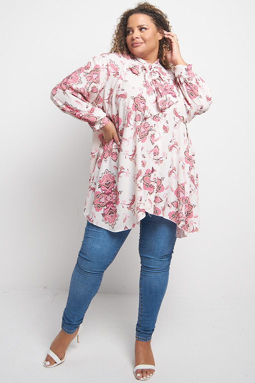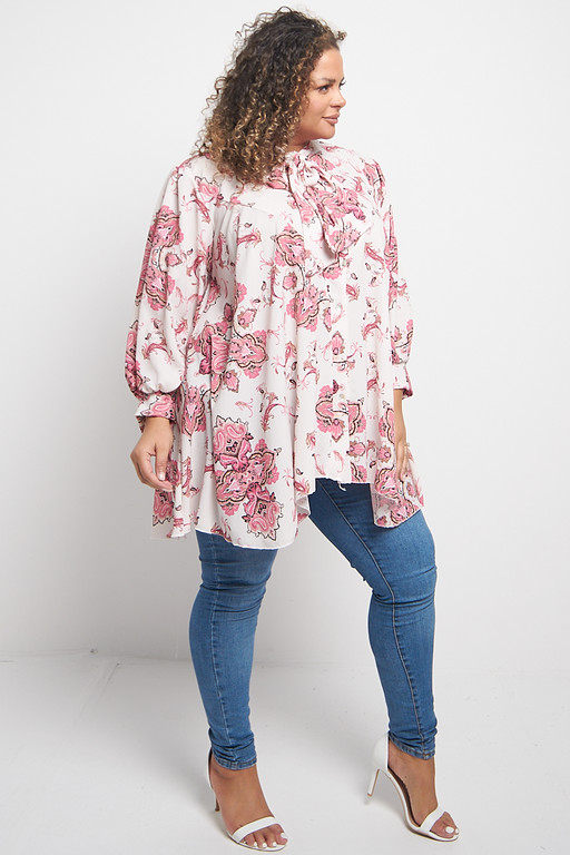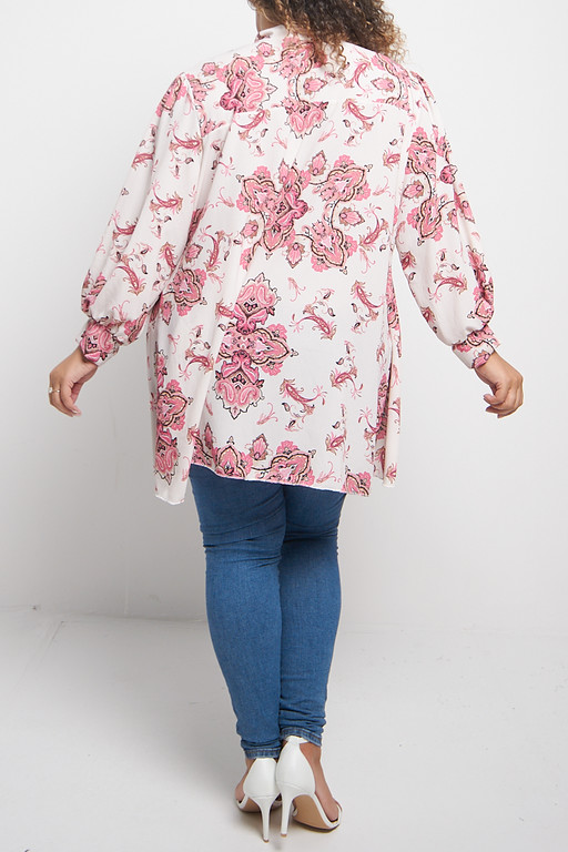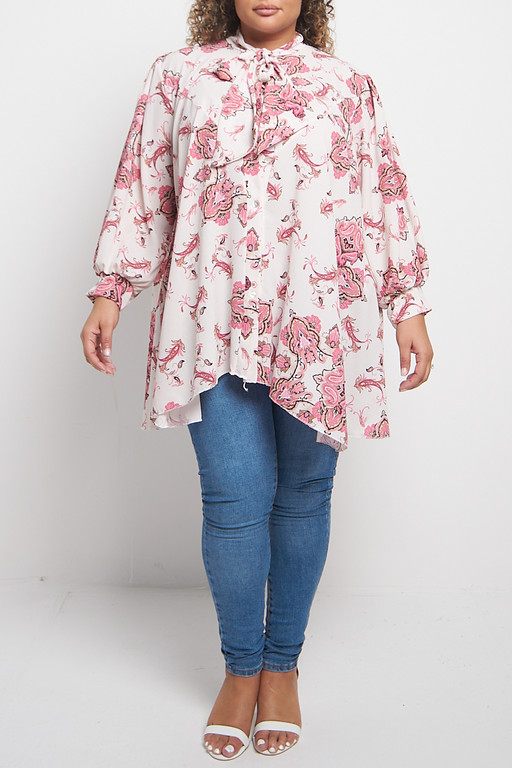 One Size Pink Paisley Pussy bow button front baloon sleeve asymmetric print top x 5