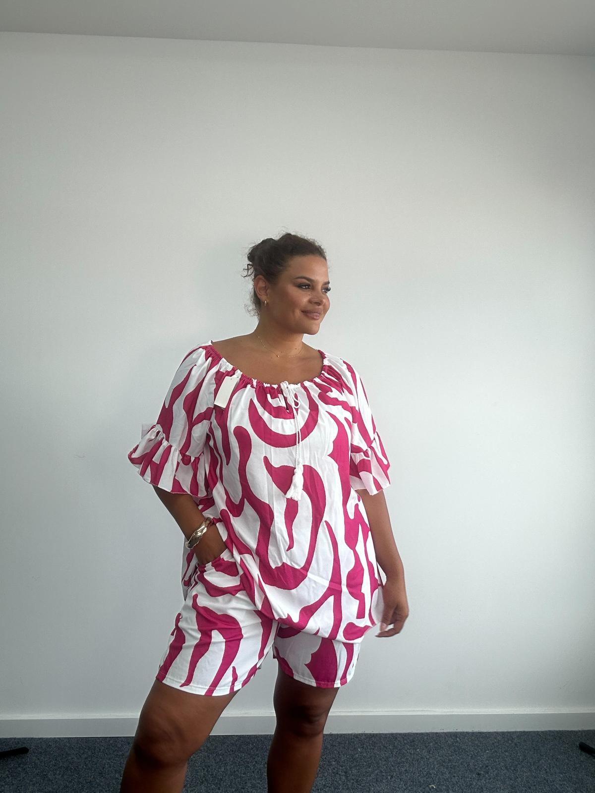 Plus Size Abstract Print Co-ord Set – Pink & White Curve Fit Top and Shorts x 5