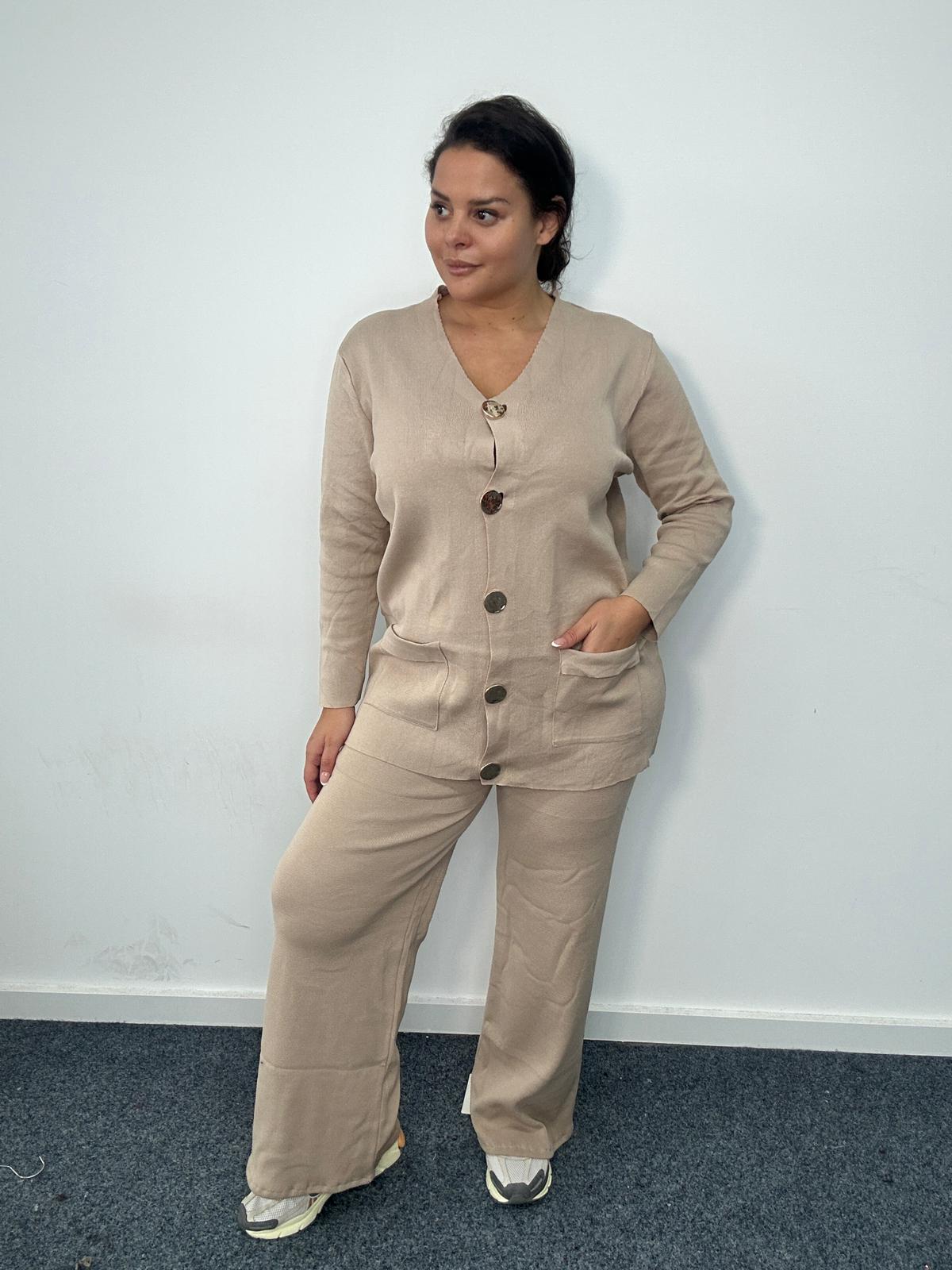 Upgrade your loungewear offering with this chic and comfortable two-piece set, designed for effortless everyday wear. Crafted from a soft, lightweight fabric, this set includes a relaxed long-sleeve top with oversized buttons and matching wide-leg trousers for a coordinated, modern look. Ideal for boutiques, online retailers, and lifestyle stores looking to expand their plus-size casualwear range.