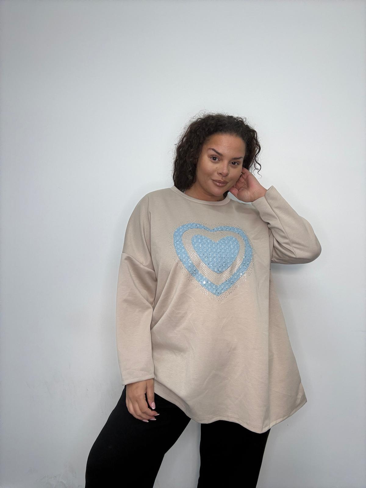 This plus size sweat-style top is a comfortable, statement-led piece designed to add colour and subtle sparkle to curve collections. Featuring a bold heart motif, it offers visual interest while remaining easy to wear and style. Cut in a relaxed, flattering fit with a classic round neckline and long sleeves, this top delivers everyday comfort with a fashion-forward edge. The soft-touch fabric makes it ideal for casual dressing, layering, and off-duty looks that plus size customers consistently gravitate towards. A strong, easy-selling option for UK wholesale buyers seeking wearable plus size styles with added detail and shelf appeal.