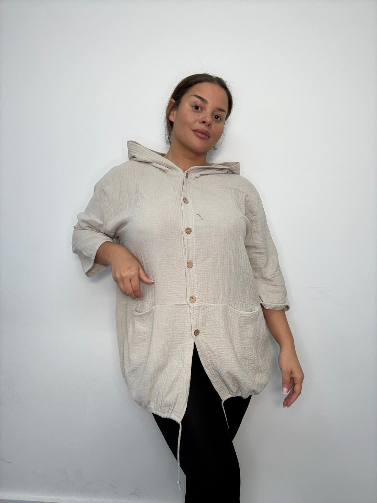 Plus Size Beige Hooded Button Through Tunic Top with Pockets x 2, 3 & 5 Pack Options