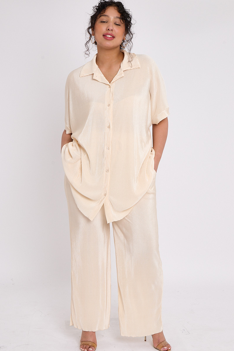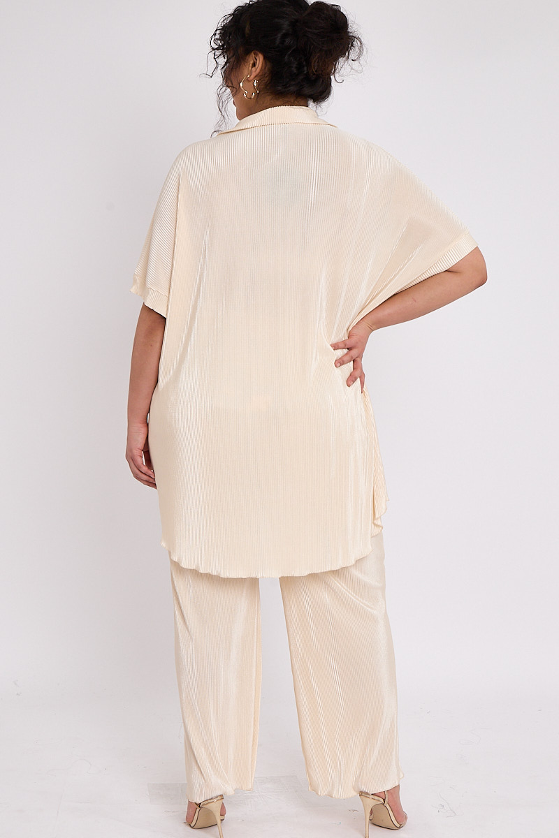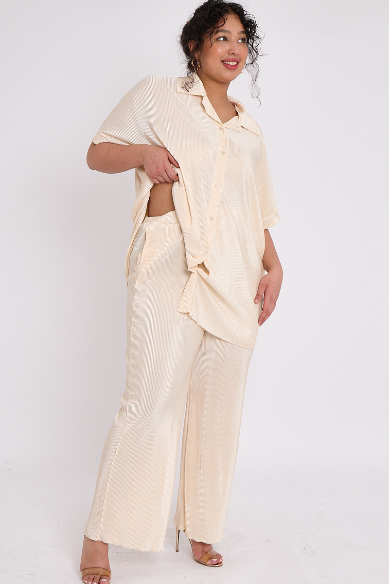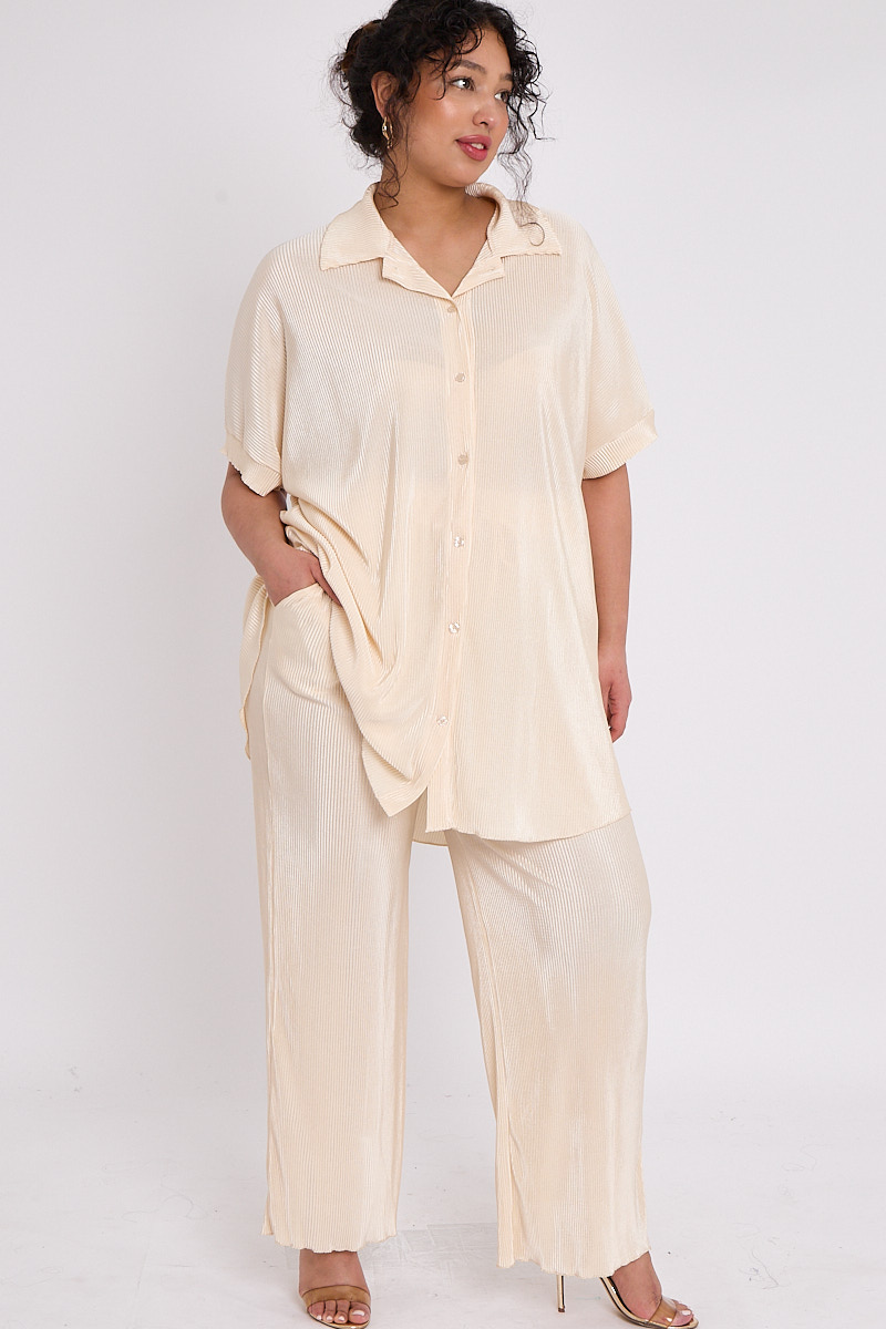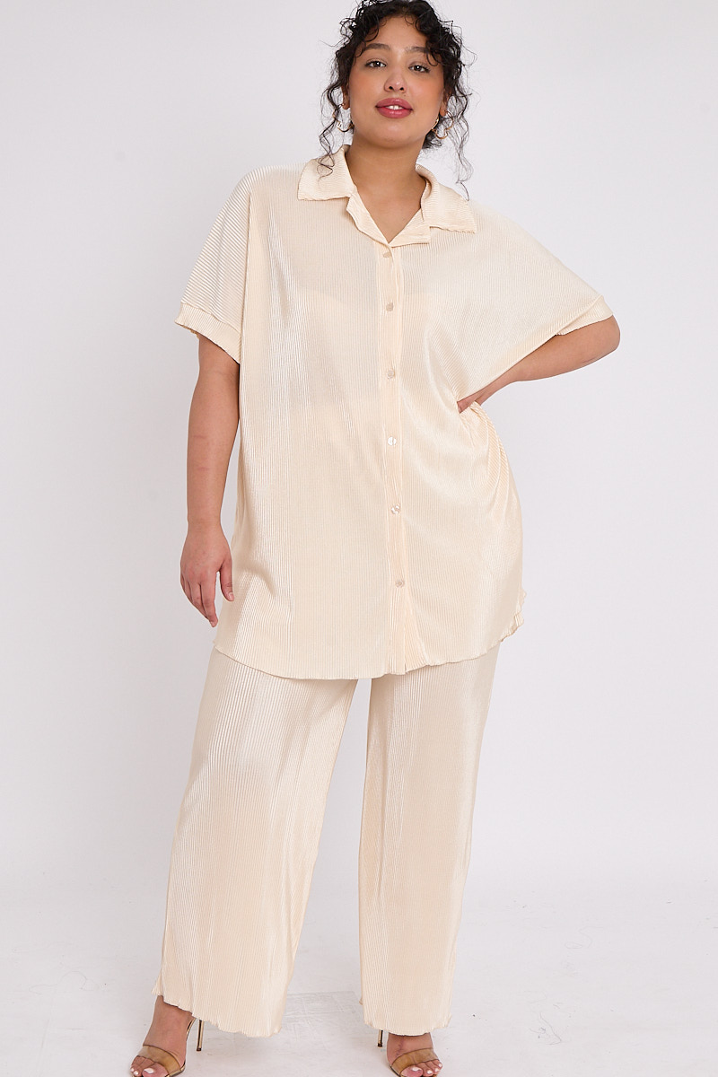 Plus Size Beige Plisse Pleat 2 Piece Co Ord Set With Short Sleeve Shirt & Wide Leg Trousers x 5