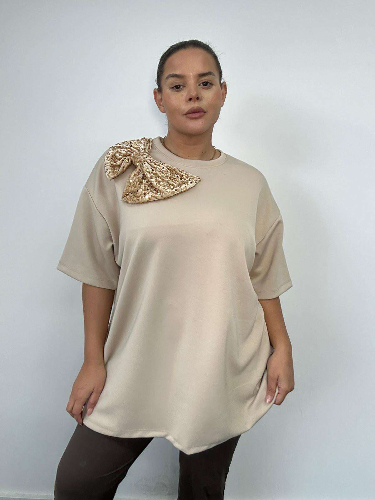 Plus Size Beige Sequin Bow Shoulder Top x 2, 3 & 5 Pack Options